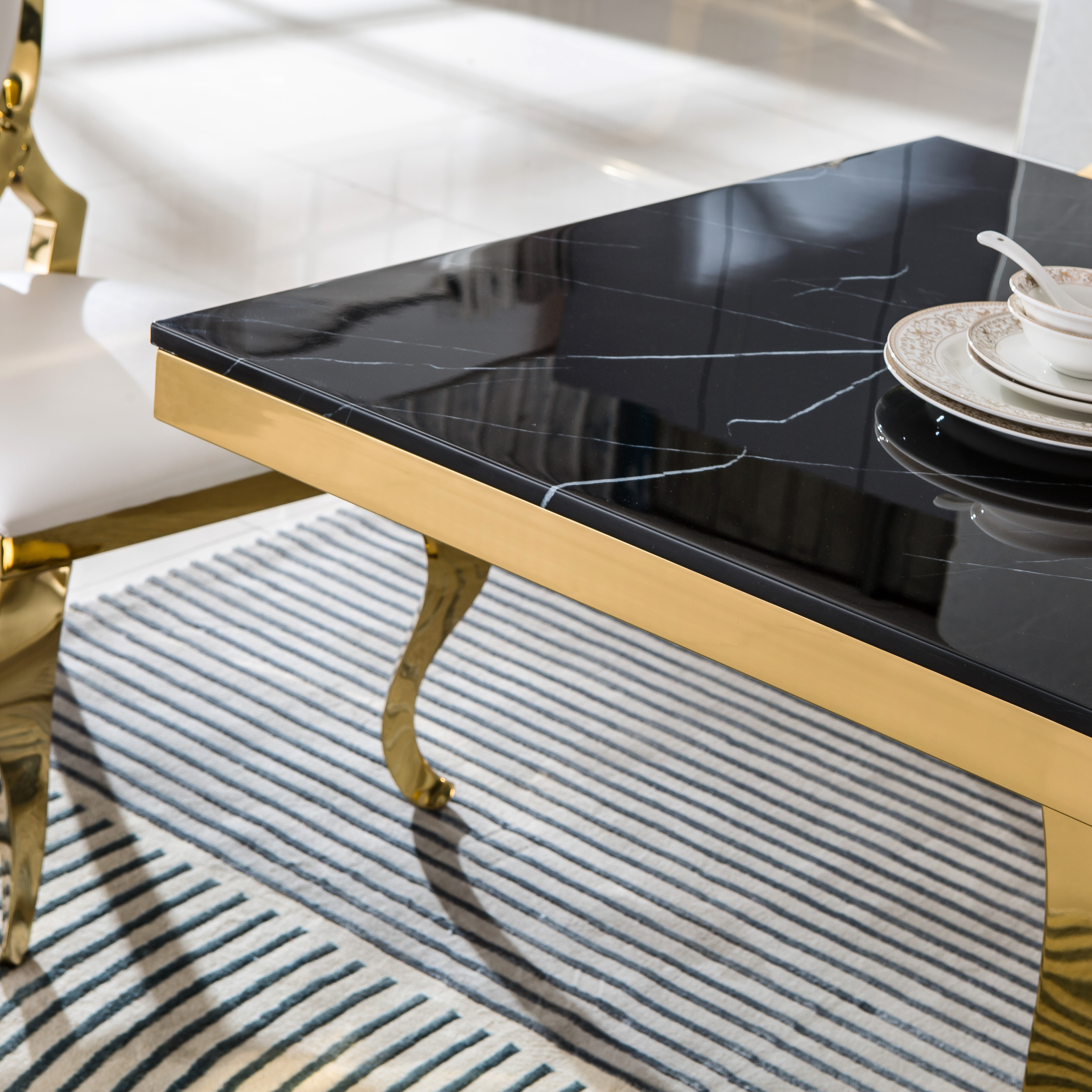 Rectangular console table of modern design with fixed 0.71" black marble top and smooth edges. Its original gold finish stainless steel base is one of the key elements to highlight in its design. A perfect table to bring the elegance and avant-garde style to your living room or other room.• STYLE: The modern design finish of this console table is ideal to combine with the latest trends in decoration. U shape design base to bring you the new artistic style. • MULTISTANCE: Versatile and functional, its rectangular marble top offers that feeling of vintage and elegance that you are looking for in your home.• QUALITY: All our console tables are made with the highest quality materials, guaranteeing durable and functional furniture.• DECORATION AND COMFORT: The combination of marble and gold finish stainless steel makes this original dining table a perfect element to bring you the art of visure• DIMENSIONS: You can find this console table in different colors, thus being able to choose the one that best suits your needs.