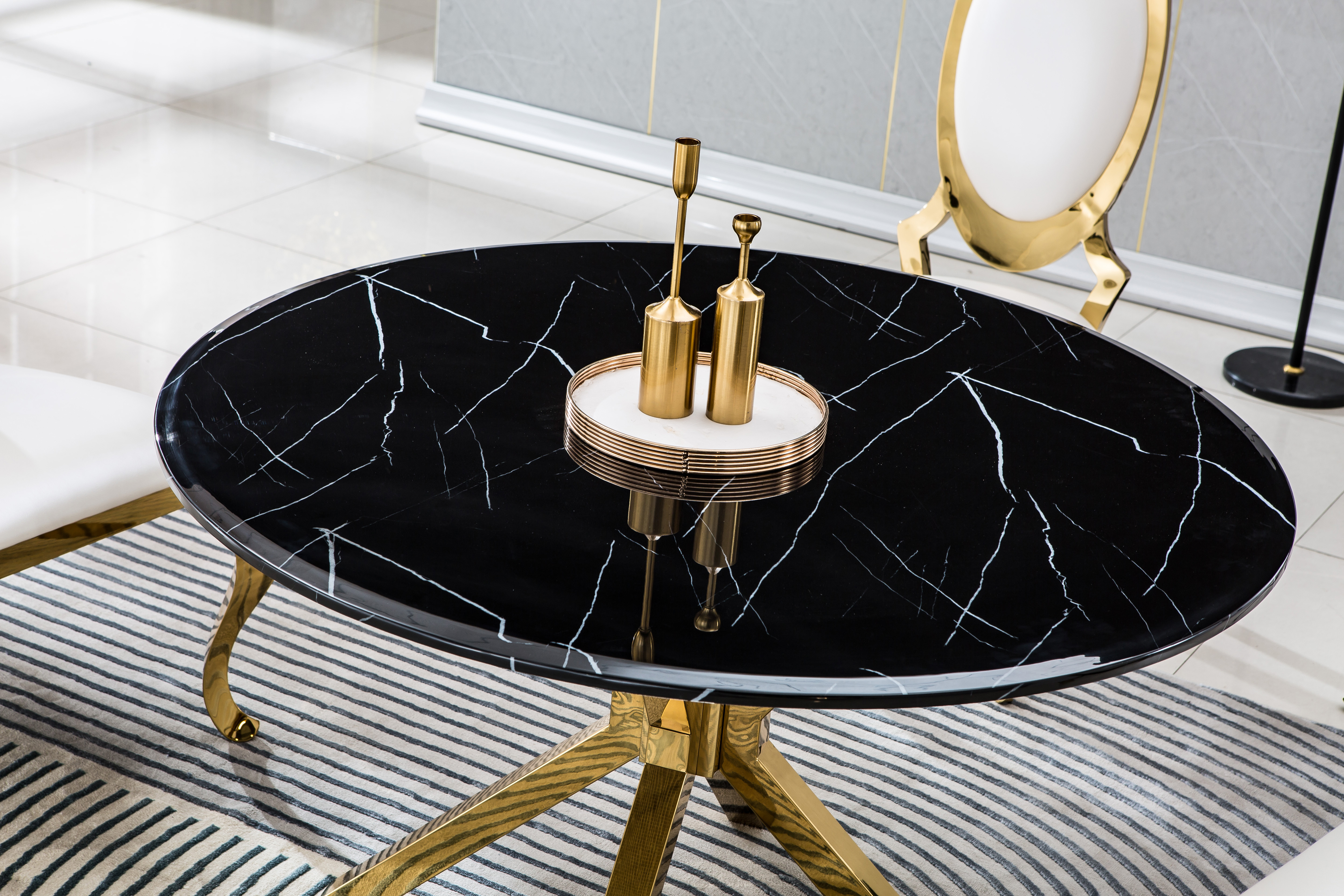 Round dining table of modern design with fixed 1.02" black marble top and smooth edges. Its original gold finish stainless steel base is one of the key elements to highlight in its design. A perfect table to bring the elegance and avant-garde style to your kitchen, living room, or dining room.