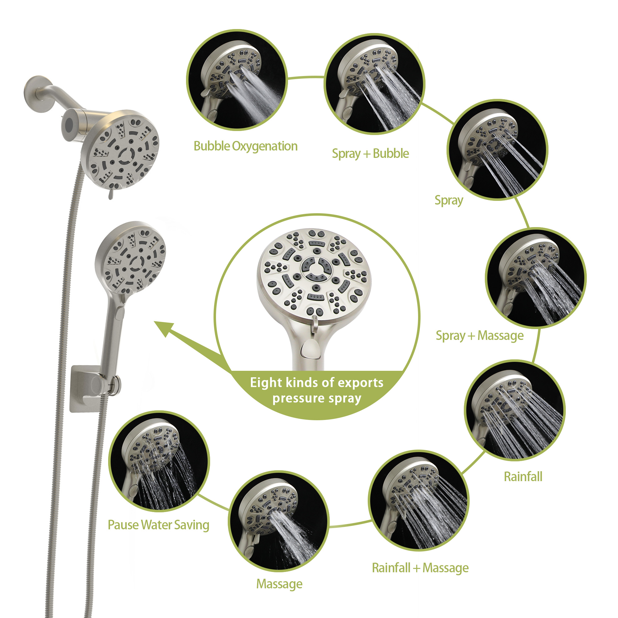 - Each shower has 8 Settings: rain, massage, spray, and other modes. Each model has its own advantages. You can choose the shower mode according to your preferences, and you can enjoy massage-like comfort in the shower.