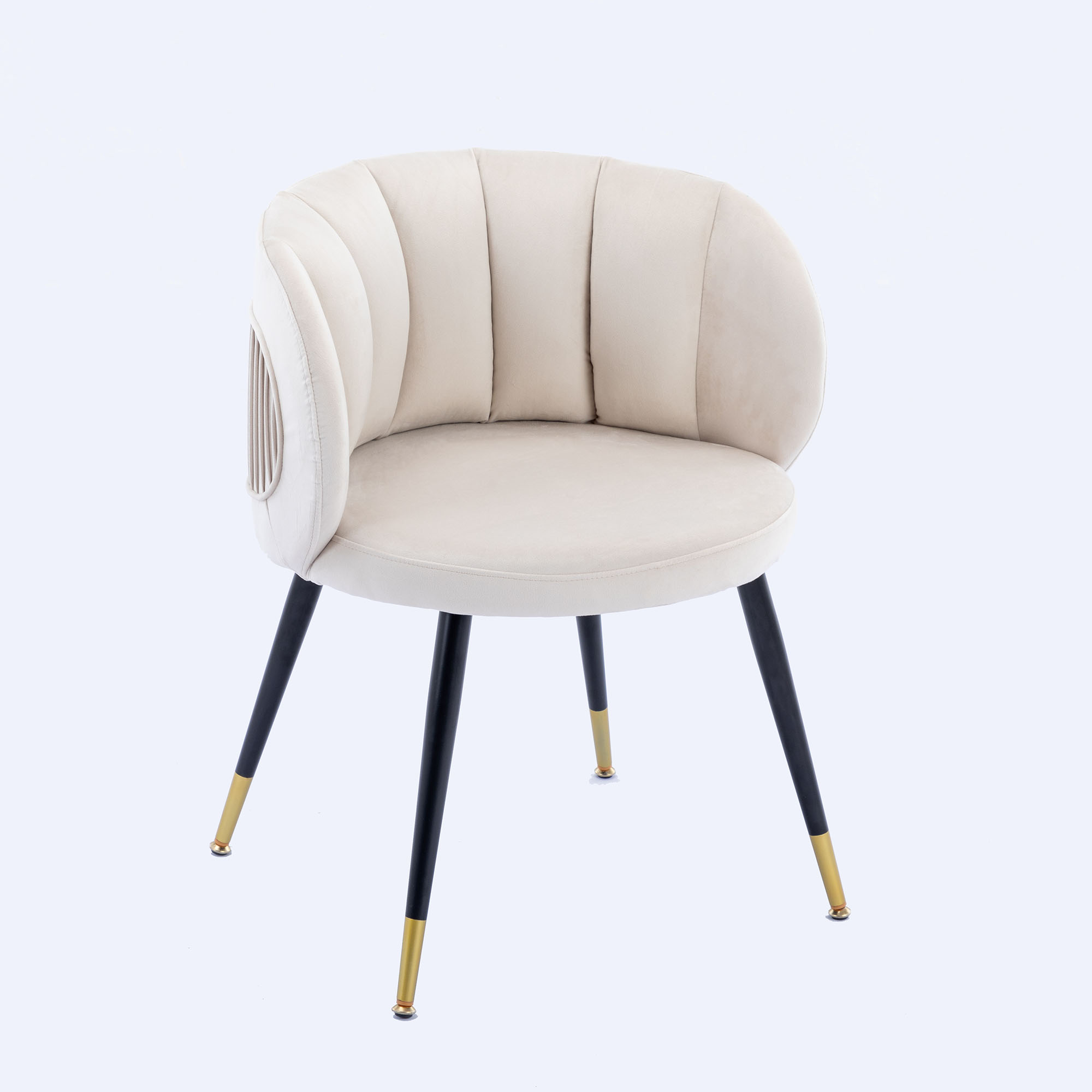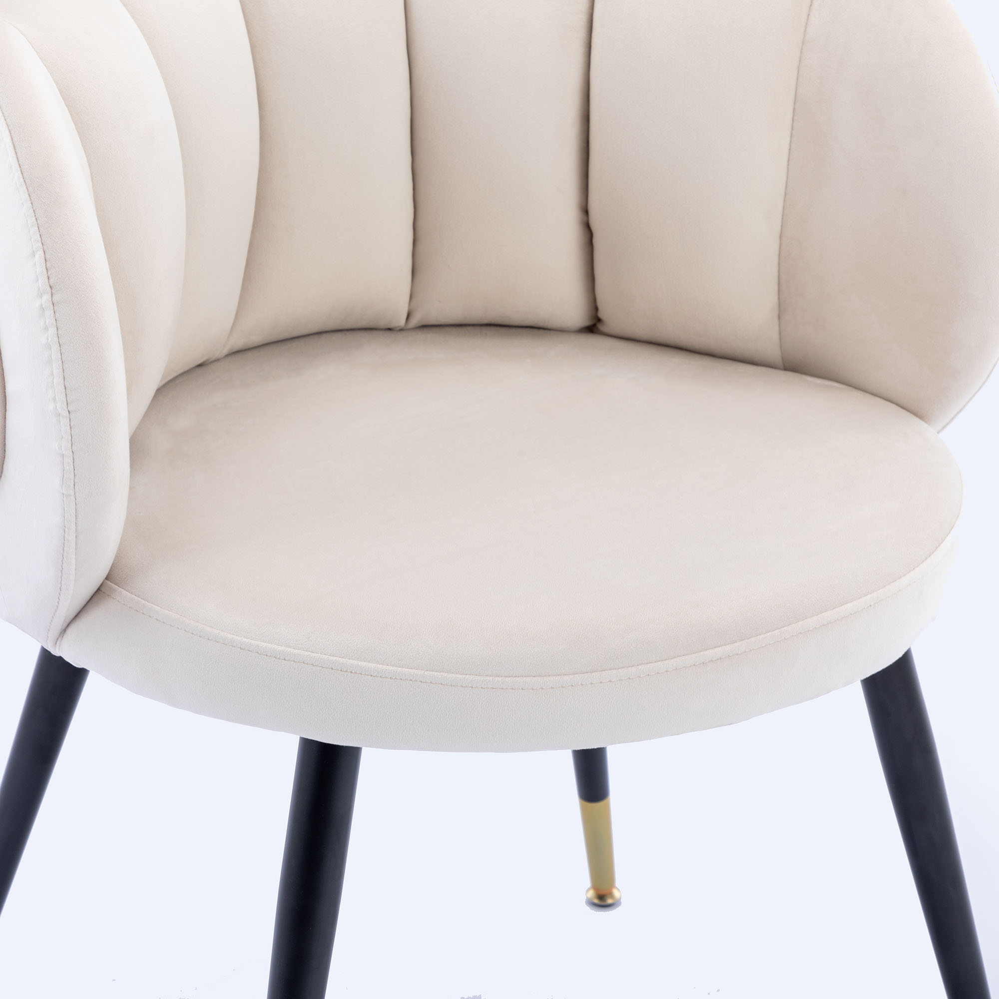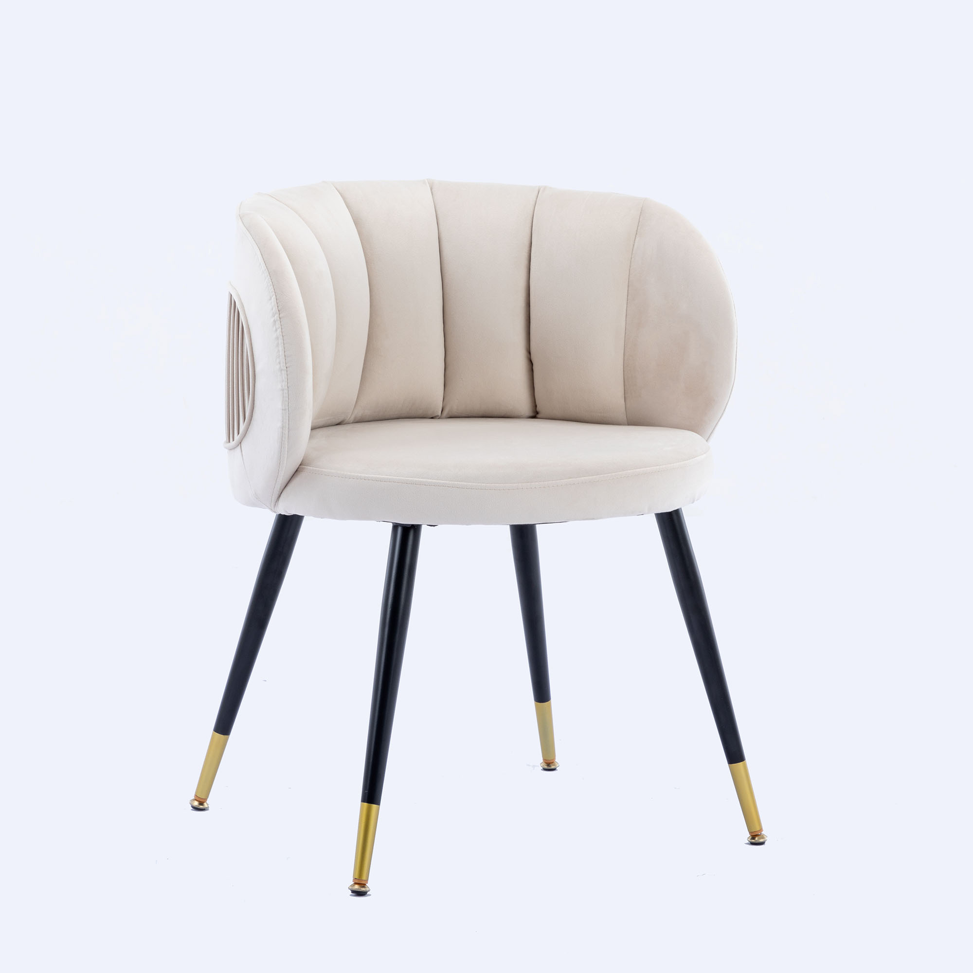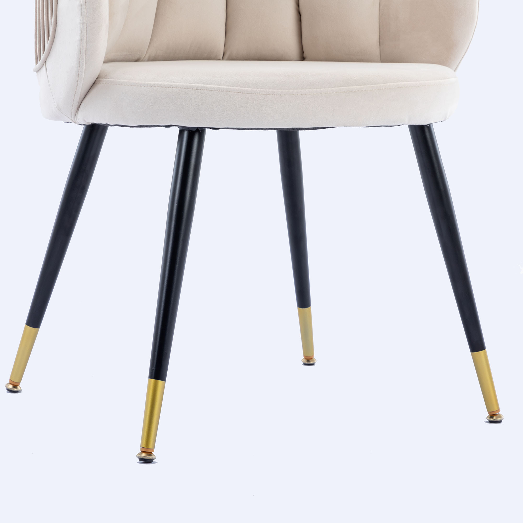 Materials selection: In the material, we chose velvet. Velvet not only has a comfortable, soft feel, but it also makes the chair look more ornate.For the interior, we use high-quality cotton.Not only will it make the chair look fuller, it will also make the chair feel more comfortable to sit on.In the choice of chair foot, we used black metal legs with gold plating at the bottom.