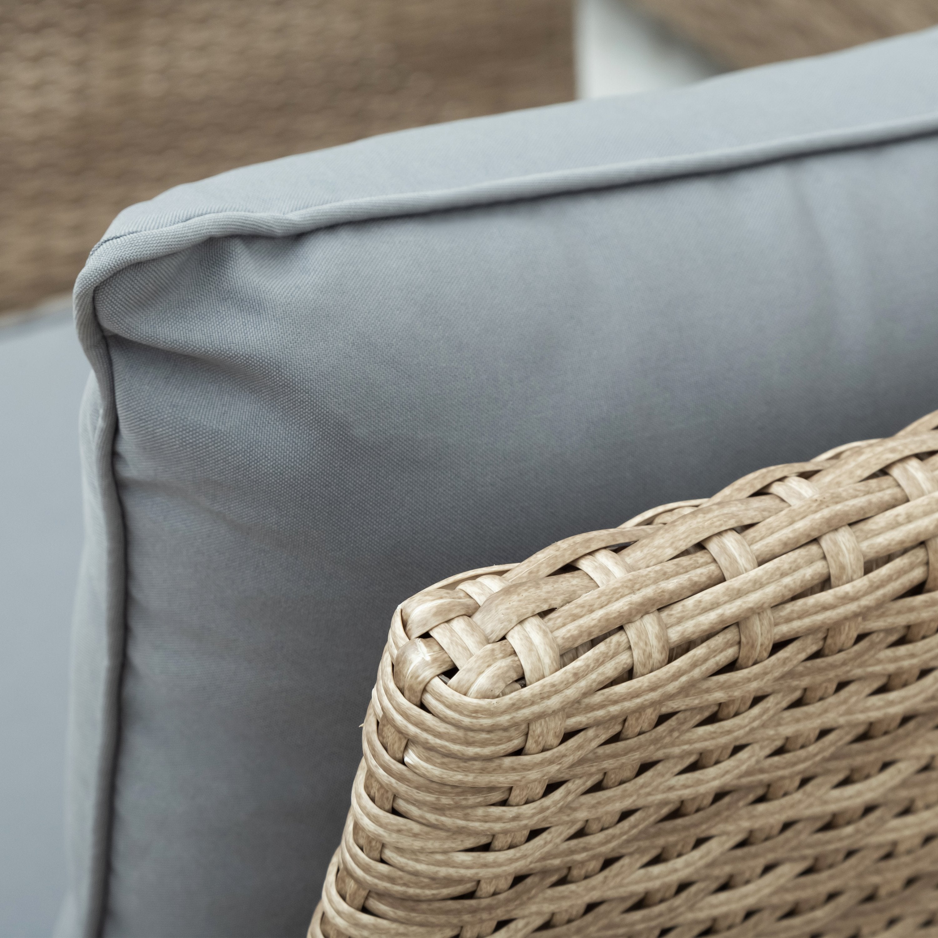 4 Pieces Rattan Sofa Set---Come with 2 two-seat sofas , 1 corner sofa, 1 tempered glass table, 6 pcs back cushions and 3 pcs seat cushions(2 long cushions are 2 singles cushions into a big cushion.) , this outdoor patio sofa set provides relaxation for 4-5 people. With unique natural color rattan, the set perfects for backyard, poolside, deck and any other indoor or outdoor places.