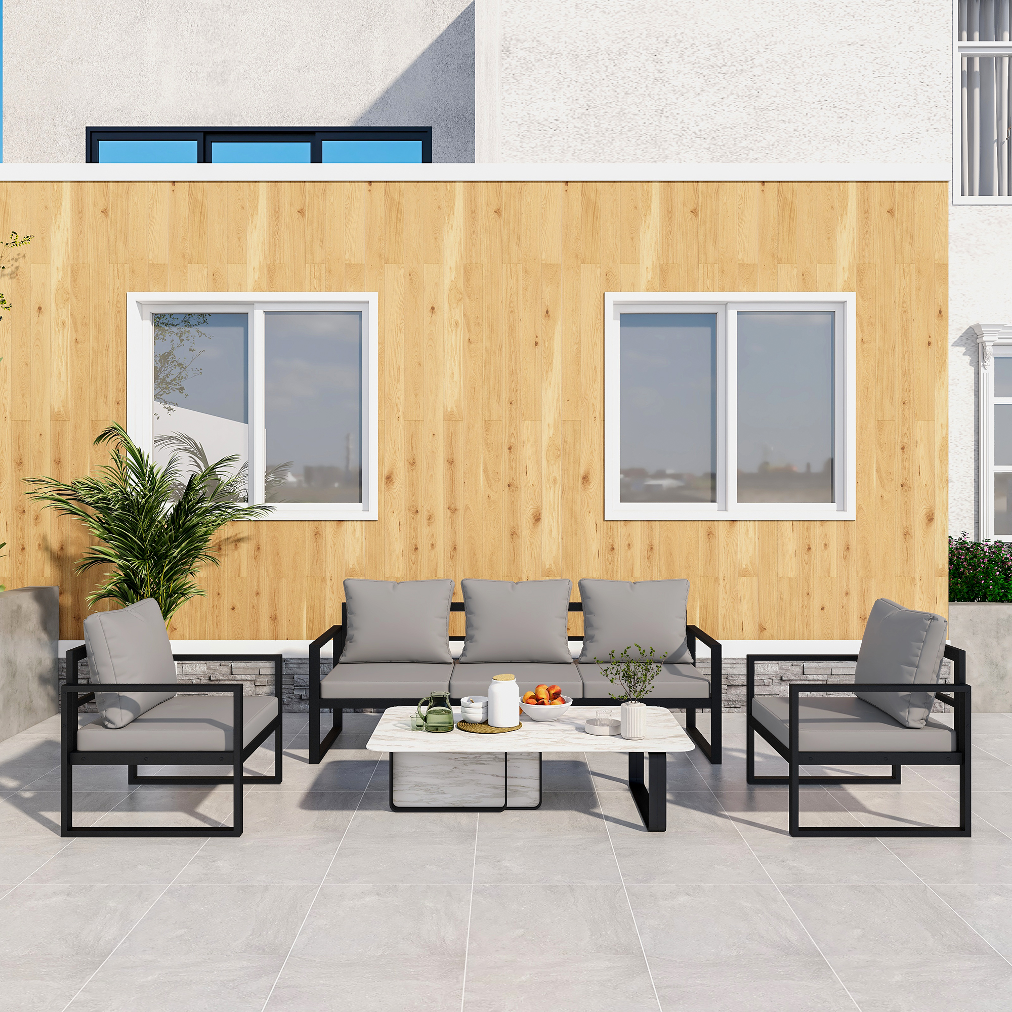 Outdoor Patio Furniture Sets with Grey Cushioncomes flat-packed in one box for easy home assembly. Please follow instructions for proper assembly.