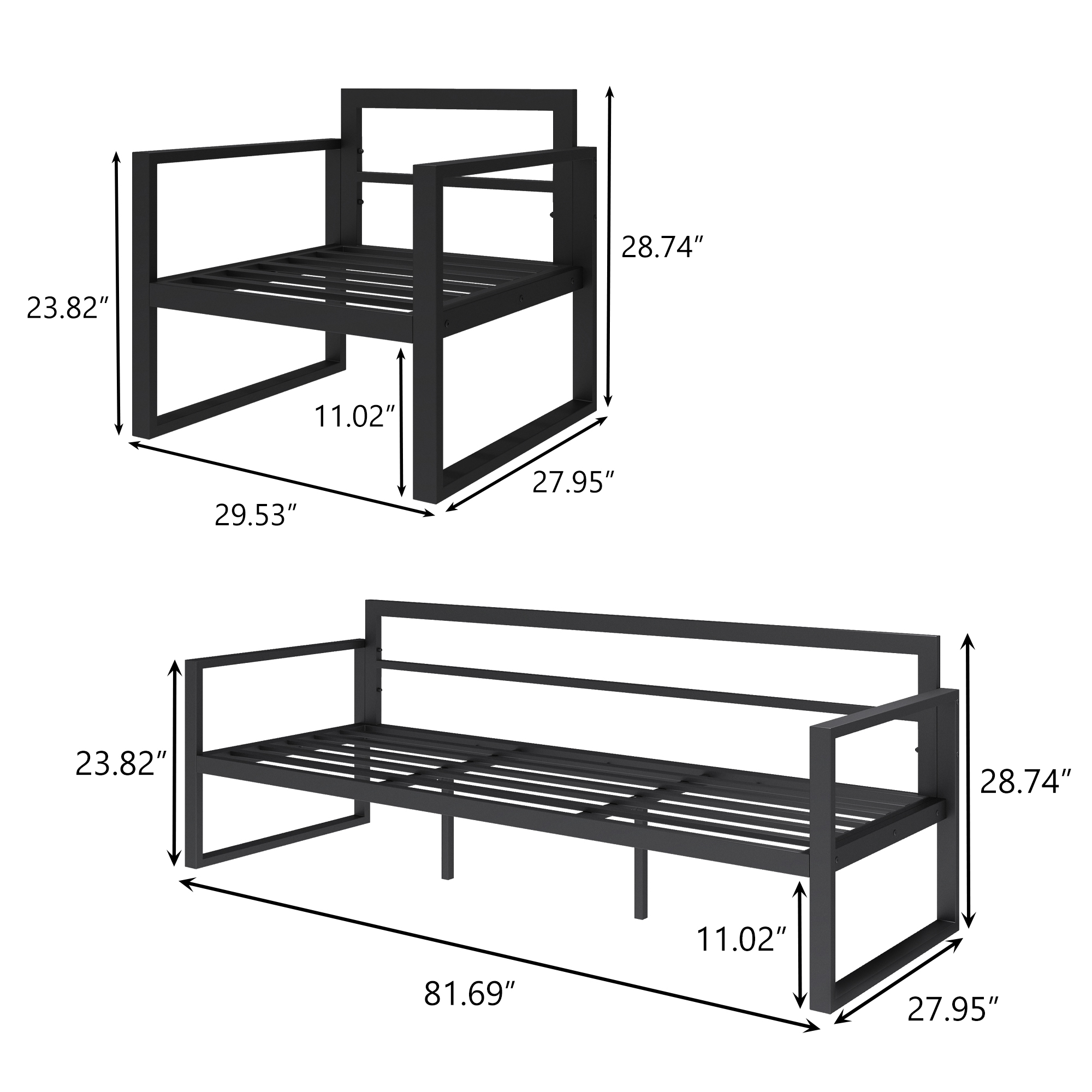 UPGRADED COMFORT - Comes with 4.7 inch thick lofty sponge padded cushions for more comfort and relaxation. Easily meet your outdoor leisure needs, ideal for both entertaining and relaxingExtensive Usage - Easily move to any place you want and be paired with other products to form conversation sets or modular sectional sofa. Ideal for garden, backyard, porch or poolside.EASY MAINTENANCE - Rustproof metal sofa is designed for the outdoors and do not require special maintenance. Zippered cushion covers can be quick disassembly for machine washingHIGH-GRADE MATERIAL-High-performance polyester cushion covers resist sun fade and abrasion; Removable cushion covers are machine washableSIZE INFORMATION - Three seat sofa: 81.69"×27.95"×28.74", 2 × Armchair:29.53”×27.95”×28.74” (Assembly required.Cushion can against droplets, but don't leave outside in the rain)