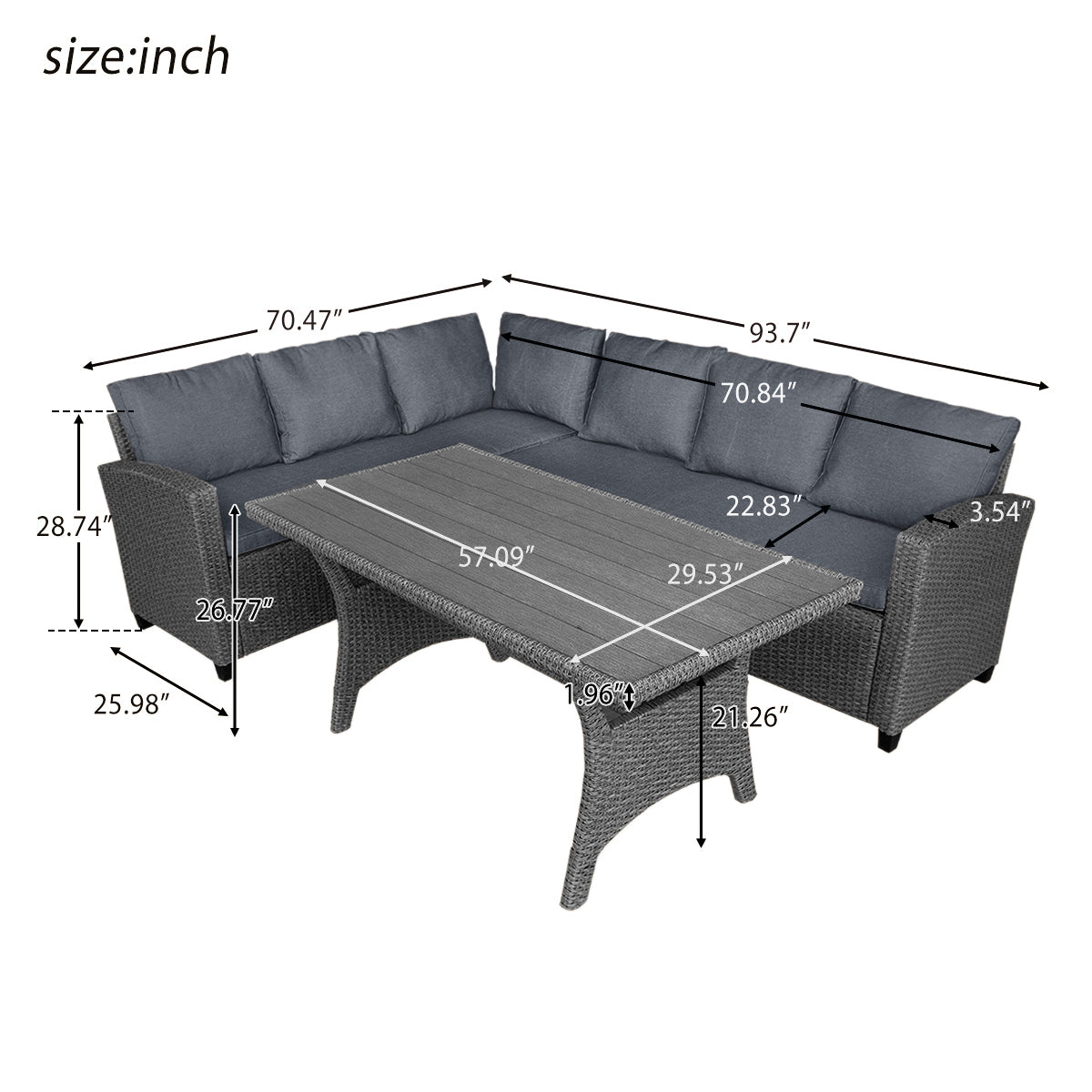 Featuring a unique gray gradient, this piece of patio furniture is an eye-catching addition for outdoor patio use. The beautiful wicker sofa and slatted faux wood table top are designed with a simple but modern design and can help to create cool and relaxing vibes for your next social event or time alone or with family.