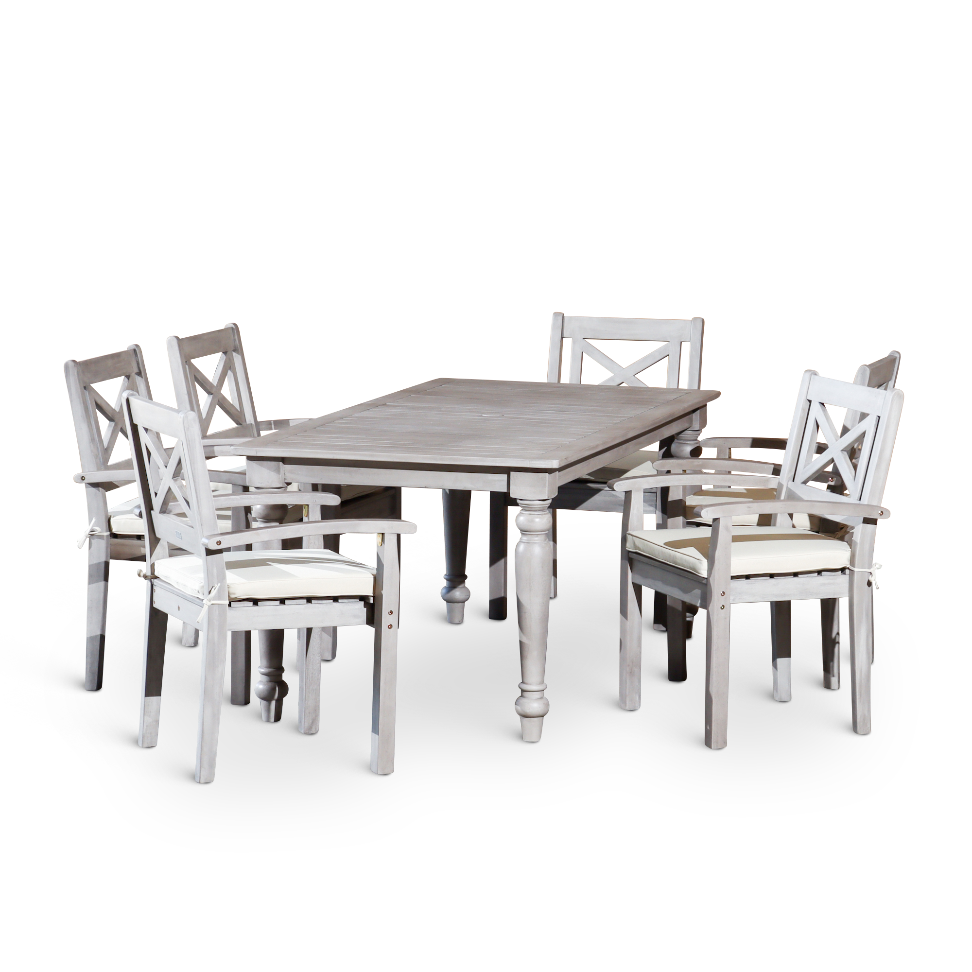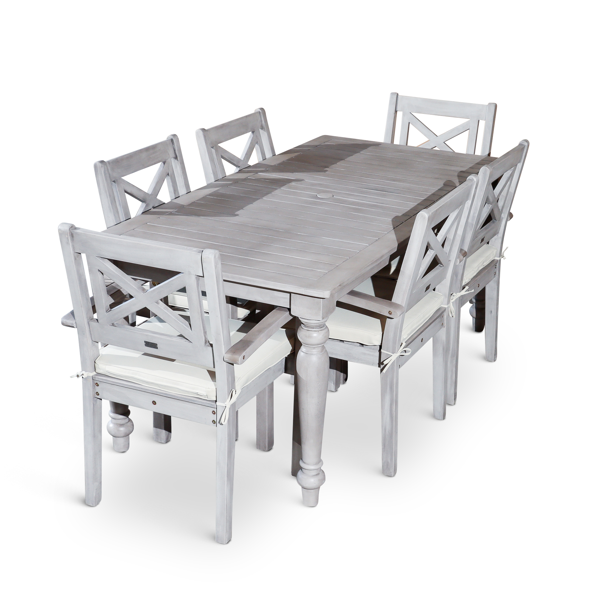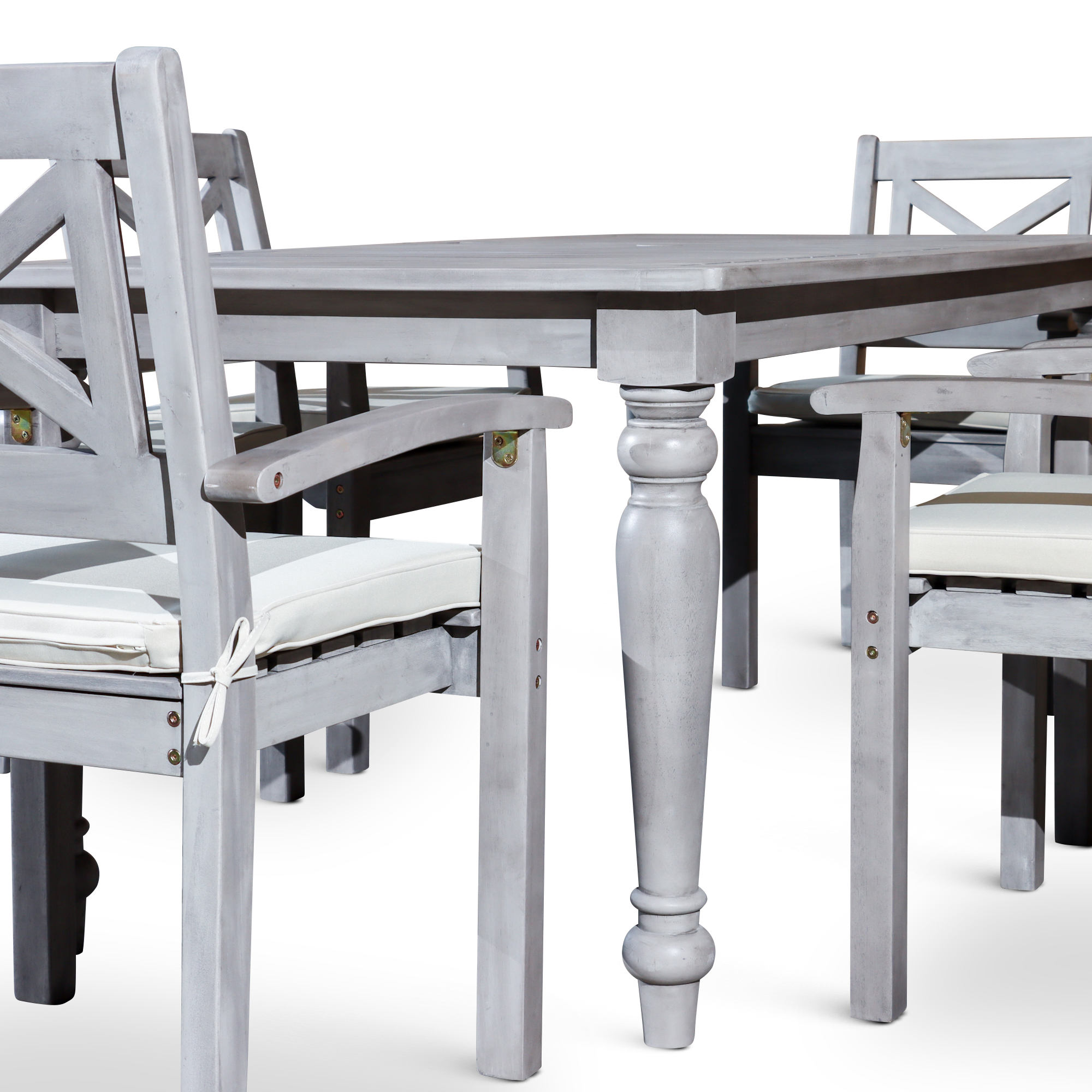 Outdoor Dining is a quintessential summer pleasure with this farmhouse-inspired dining set. Expertly crafted with turned leg detailing on the dining table and X-back styling on the armchairs. The multi-step, hand-applied Silver Gray finish creates an exceptional depth of color. The table features an opening in the center to accommodate an umbrella and a plug for the opening when no umbrella is needed. The chairs feature a curved arm and wide seat with a detachable cushion for comfort. The dining chairs stack for ease of storage in the off-season.