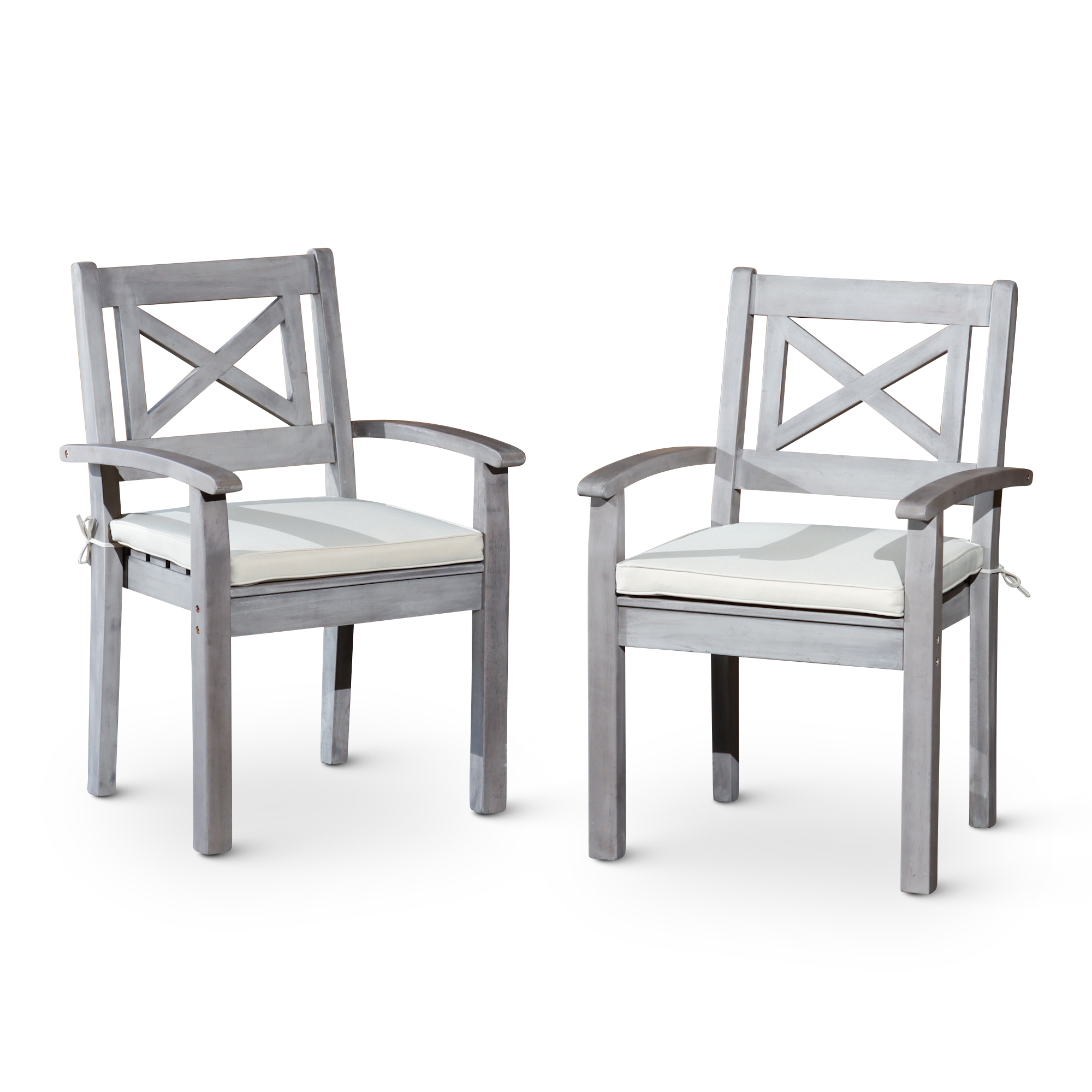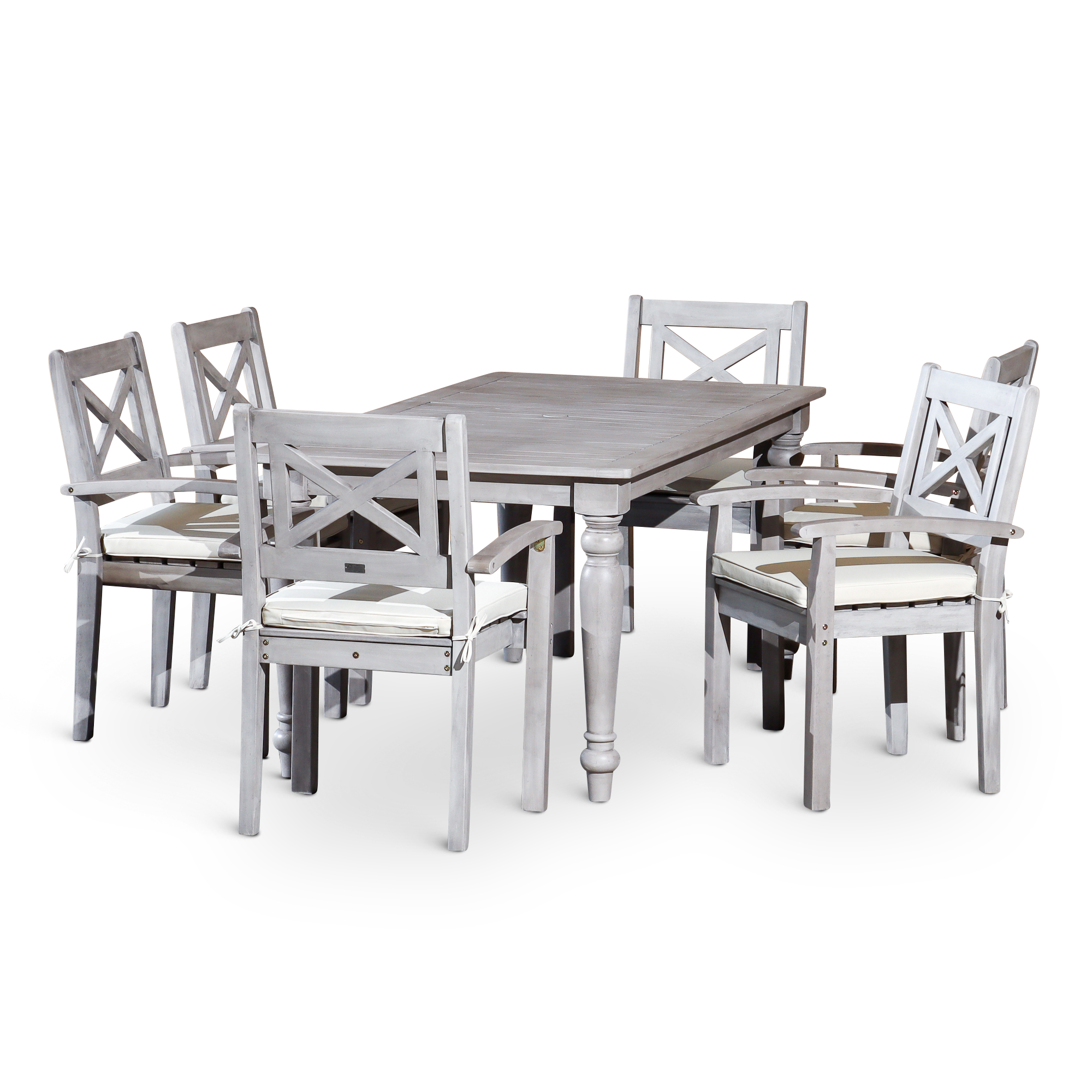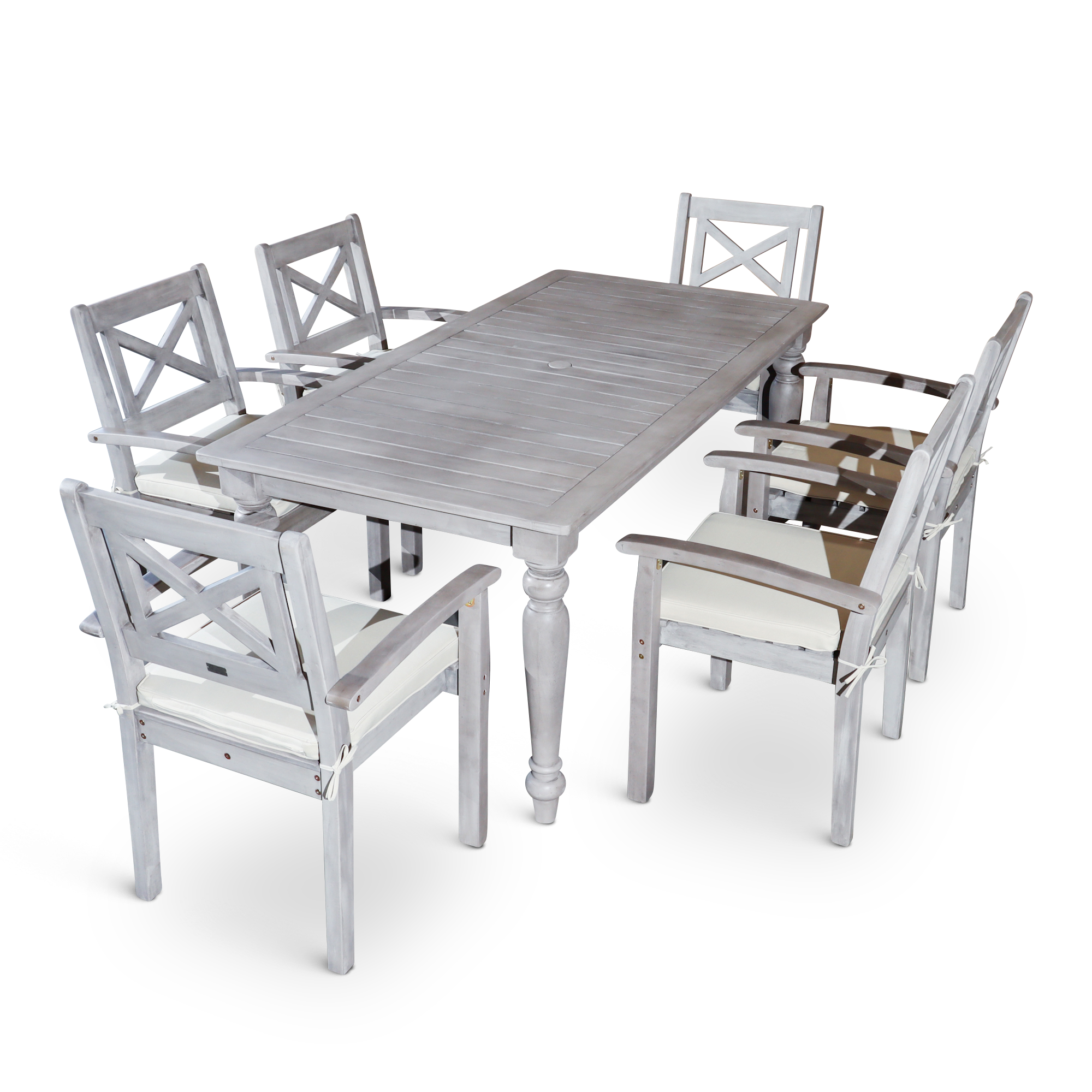 Outdoor Dining is a quintessential summer pleasure with this farmhouse-inspired dining set. Expertly crafted with turned leg detailing on the dining table and X-back styling on the armchairs. The multi-step, hand-applied Silver Gray finish creates an exceptional depth of color. The table features an opening in the center to accommodate an umbrella and a plug for the opening when no umbrella is needed. The chairs feature a curved arm and wide seat with a detachable cushion for comfort. The dining chairs stack for ease of storage in the off-season.