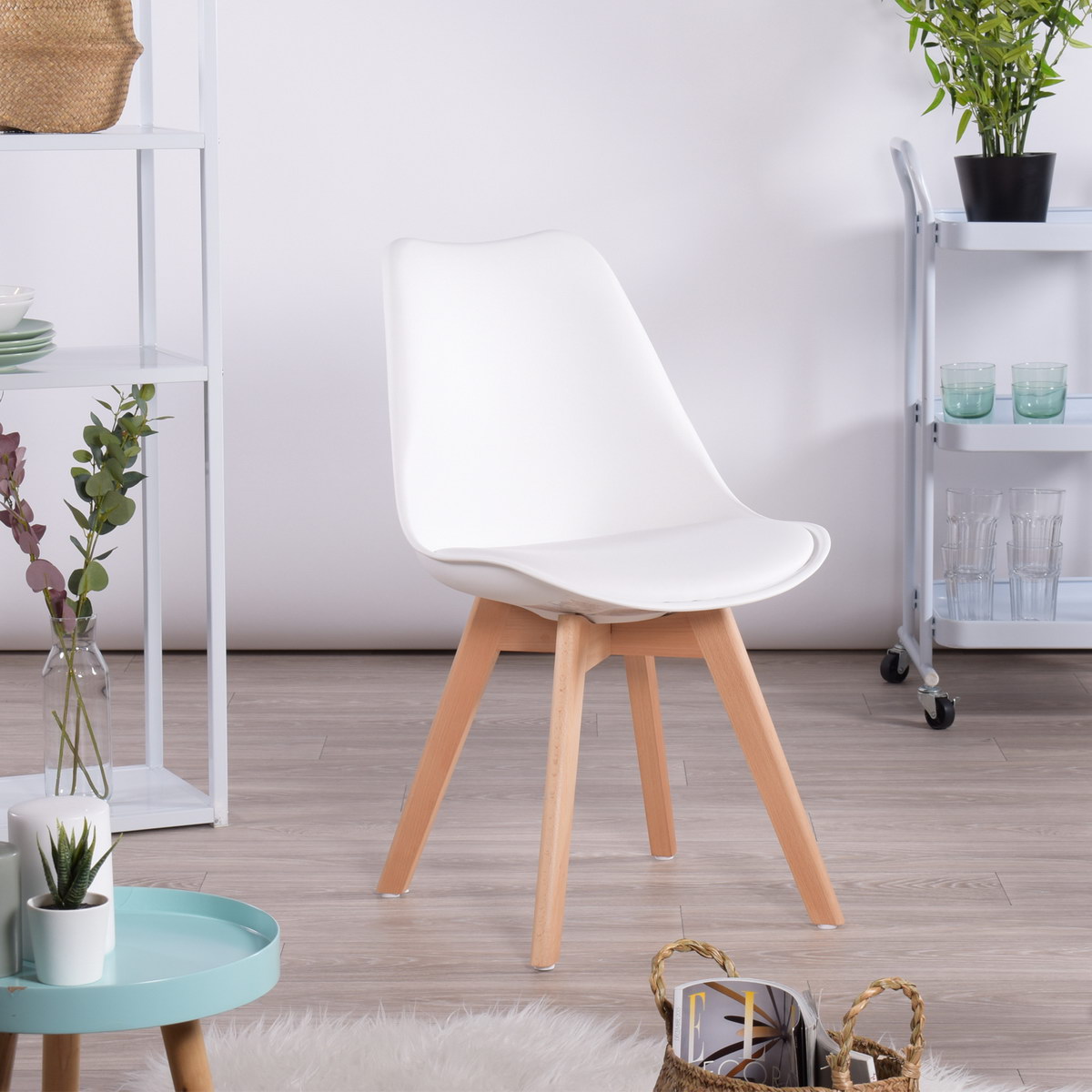 - They have beech wood legs and a plastic body with a synthetic leather seat covering.