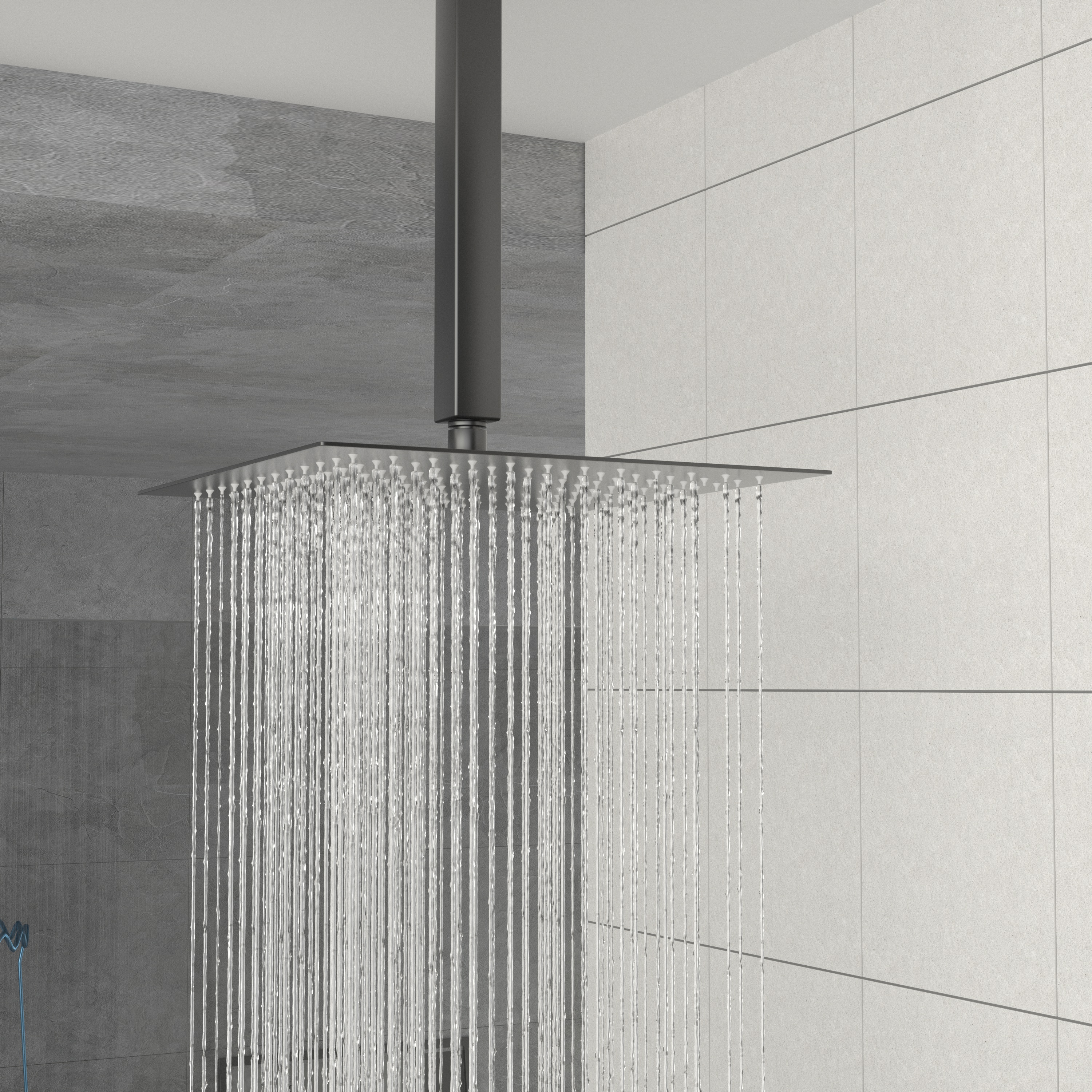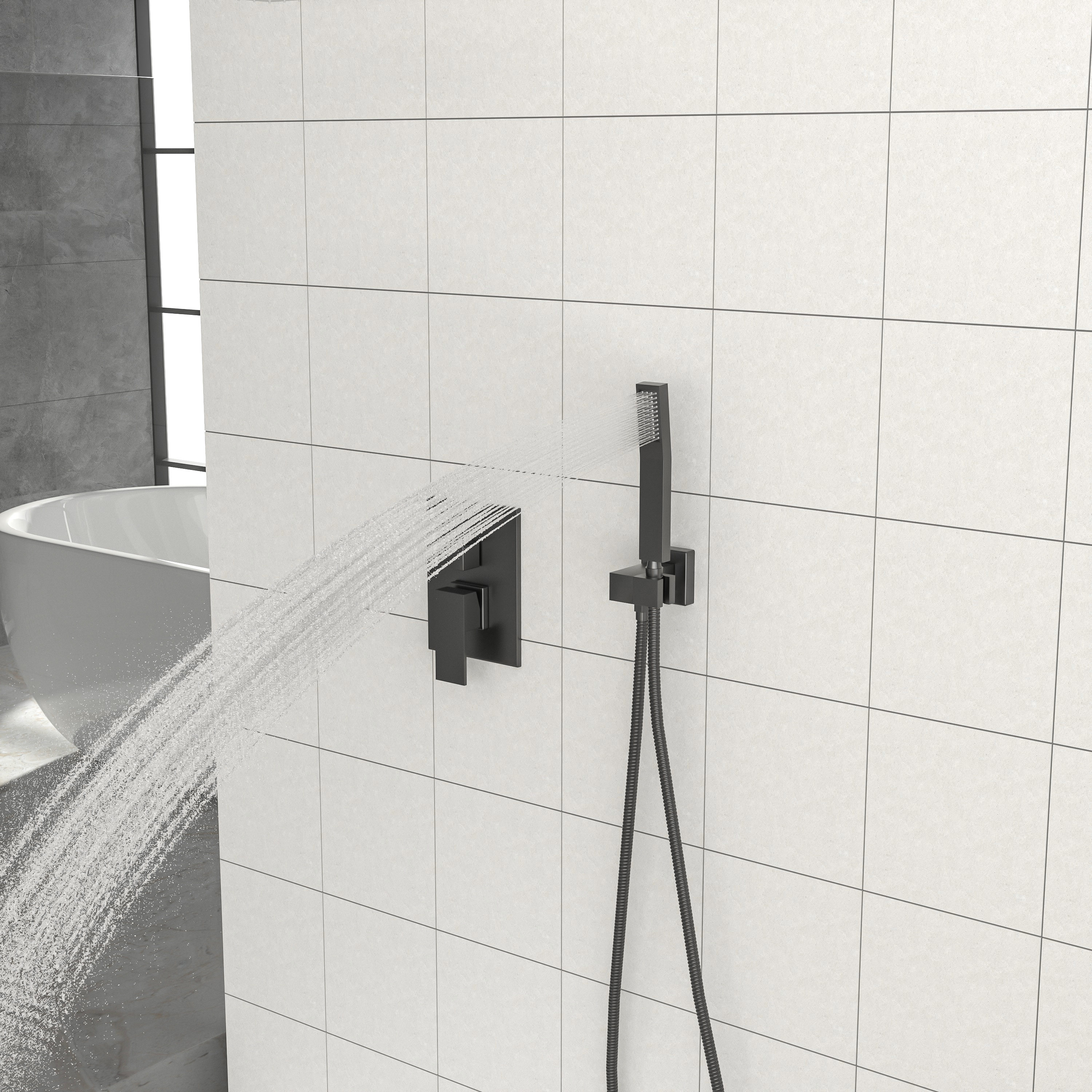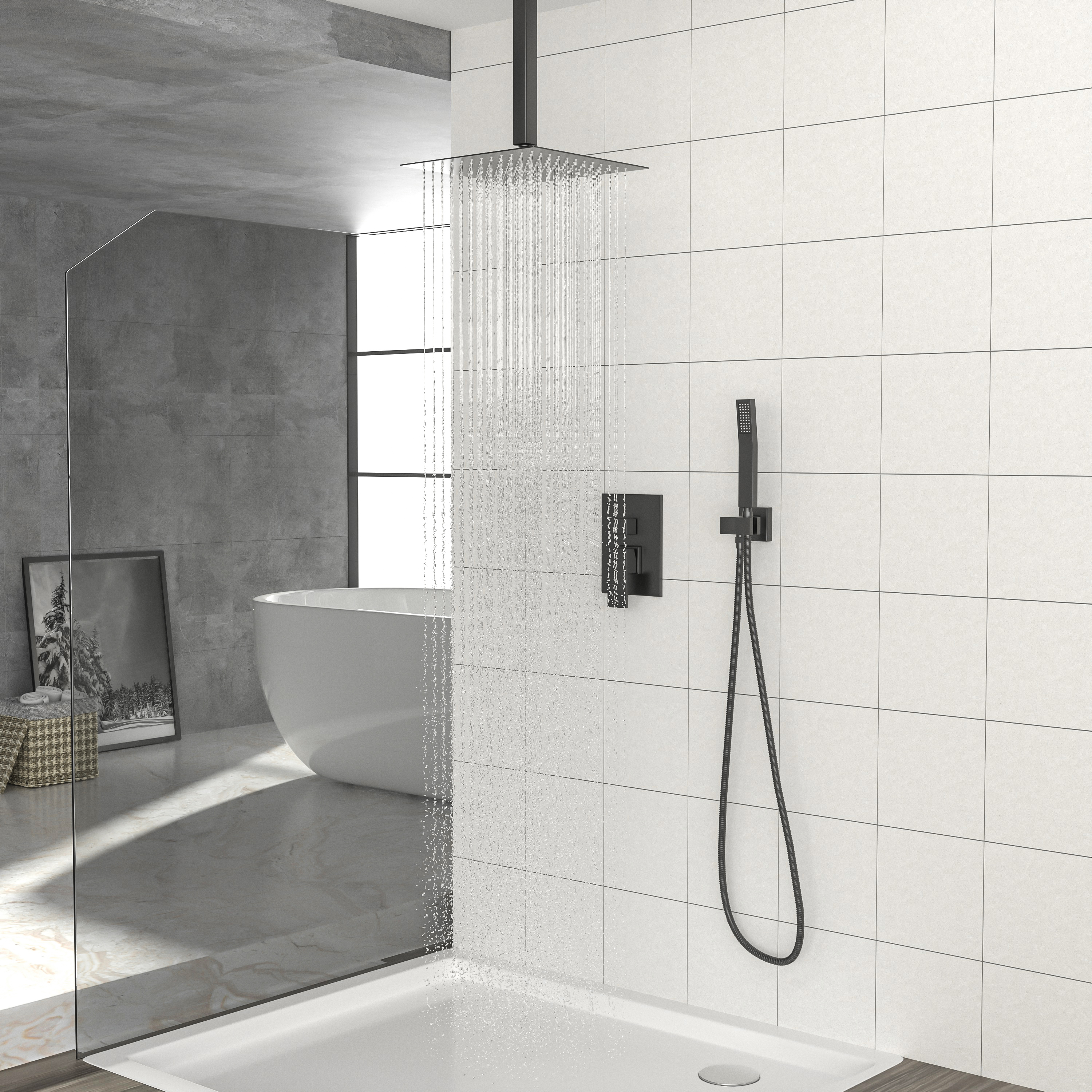 Dual function 304 stainless steel square shower concealed set, solid brass shower mixing valve. 12 inch ceiling mounted shower arm with enamel cover, corrosion resistant, high temperature resistant, not easy to aging, with shower arm, hose easy to install, different function shower to provide you with a comfortable shower, so you have the ultimate bathing experience.