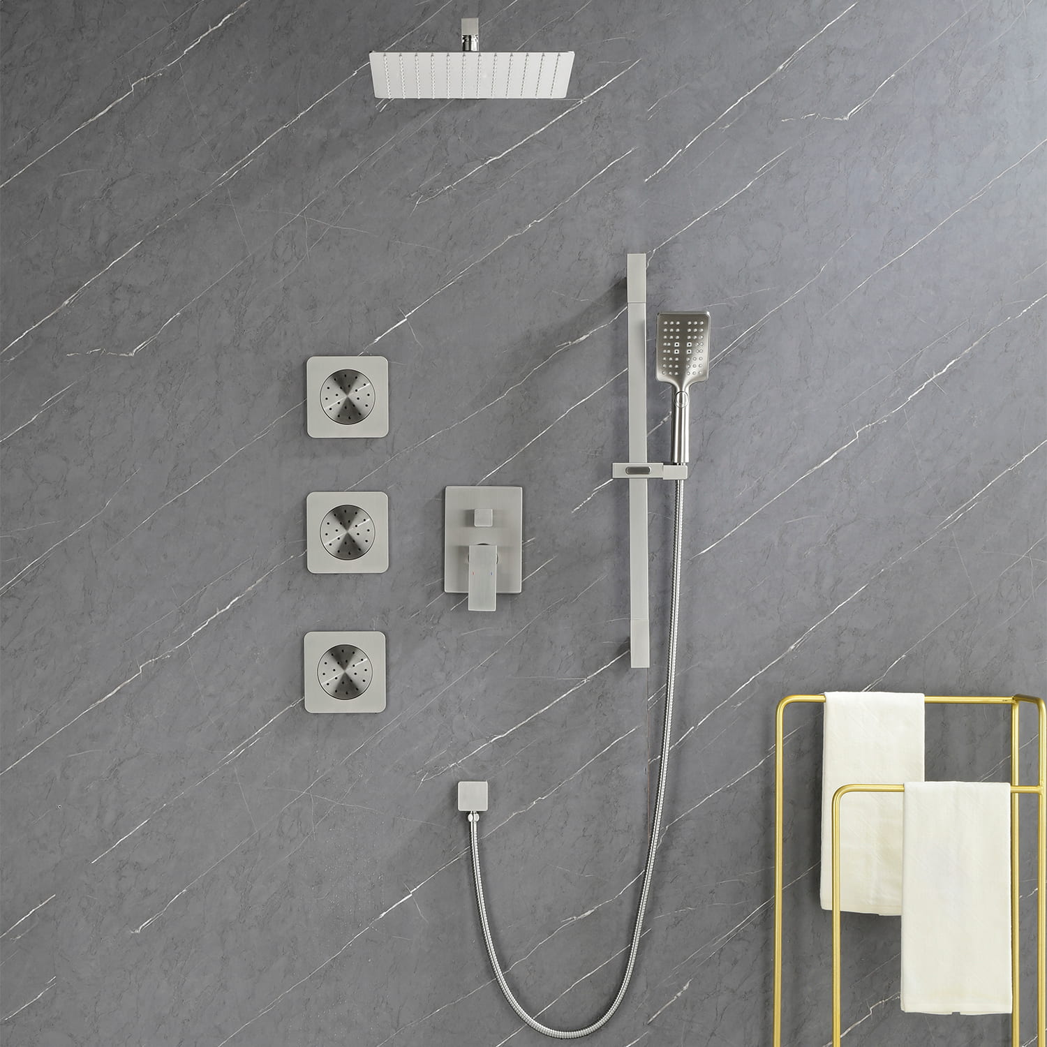 3-function pressure balance valve, 3 side spray, 1.5m 304 stainless steel hose, 400mm wall pipe, 12 inch square 304 stainless steel top spray, stainless steel lifting rod