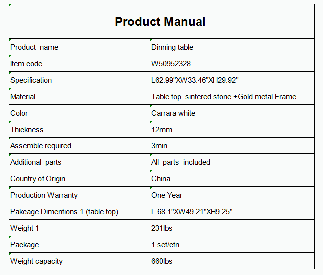 Color: Carrara White table top +Gold frame