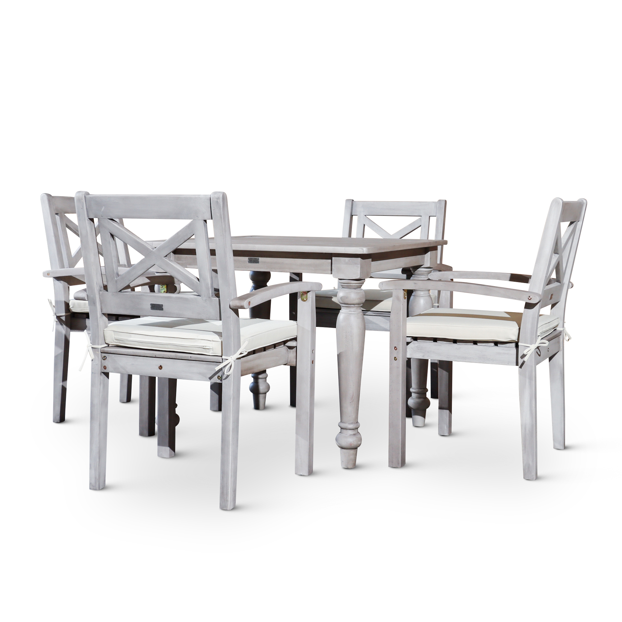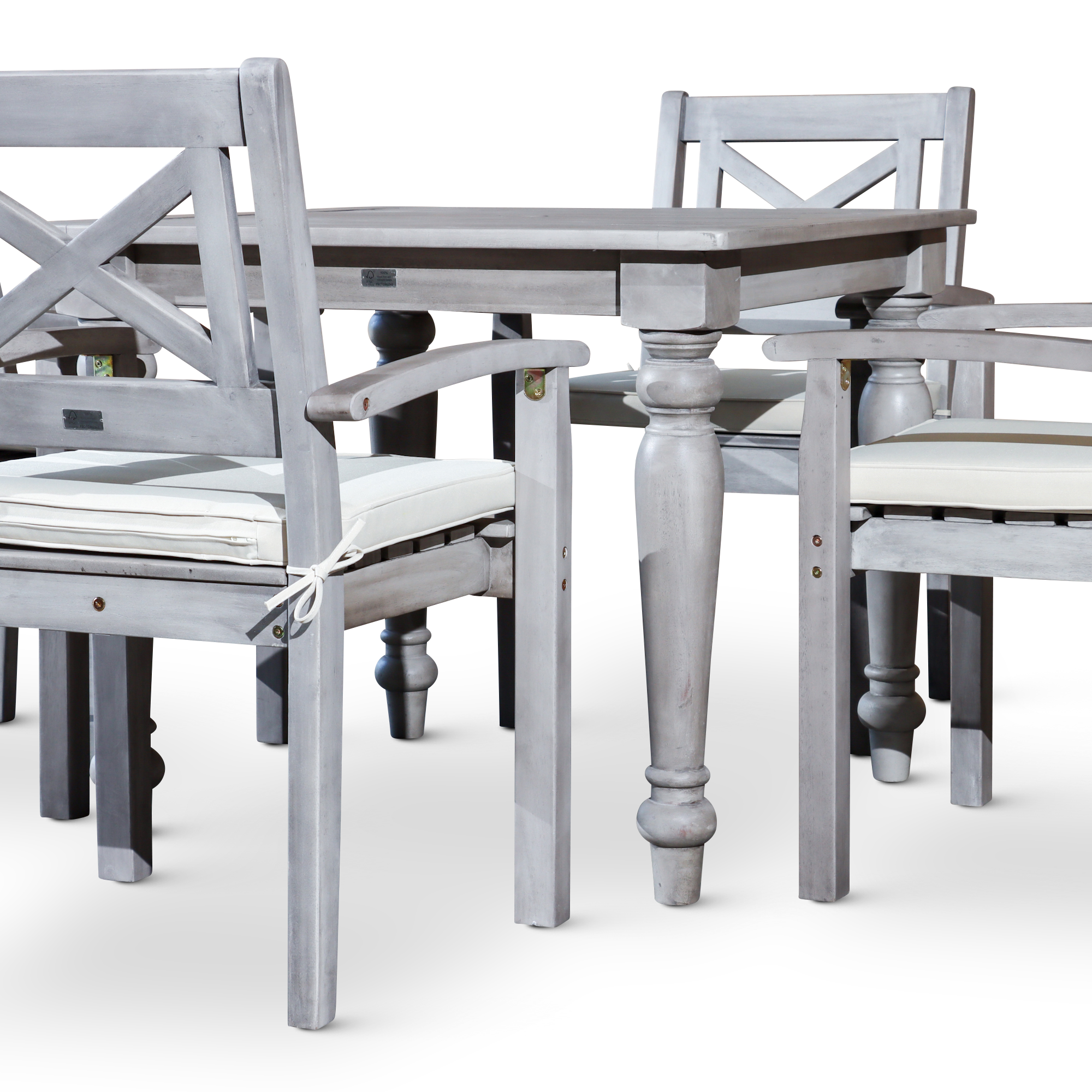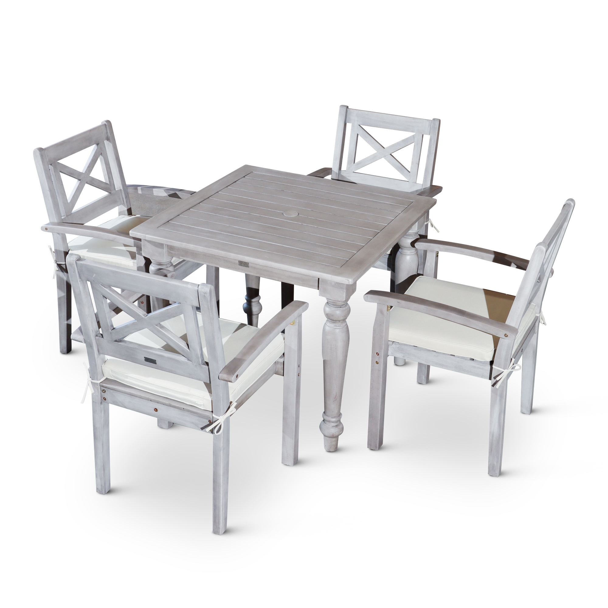 • STYLISH DESIGN: Casual yet stylish this dining set is sure to make your summer gatherings a success. The set features a square table with beautifully turned legs and a glazed Silver Gray finish, an umbrella hole and plug, and 4 armchairs with cushions that stack for easy storage.