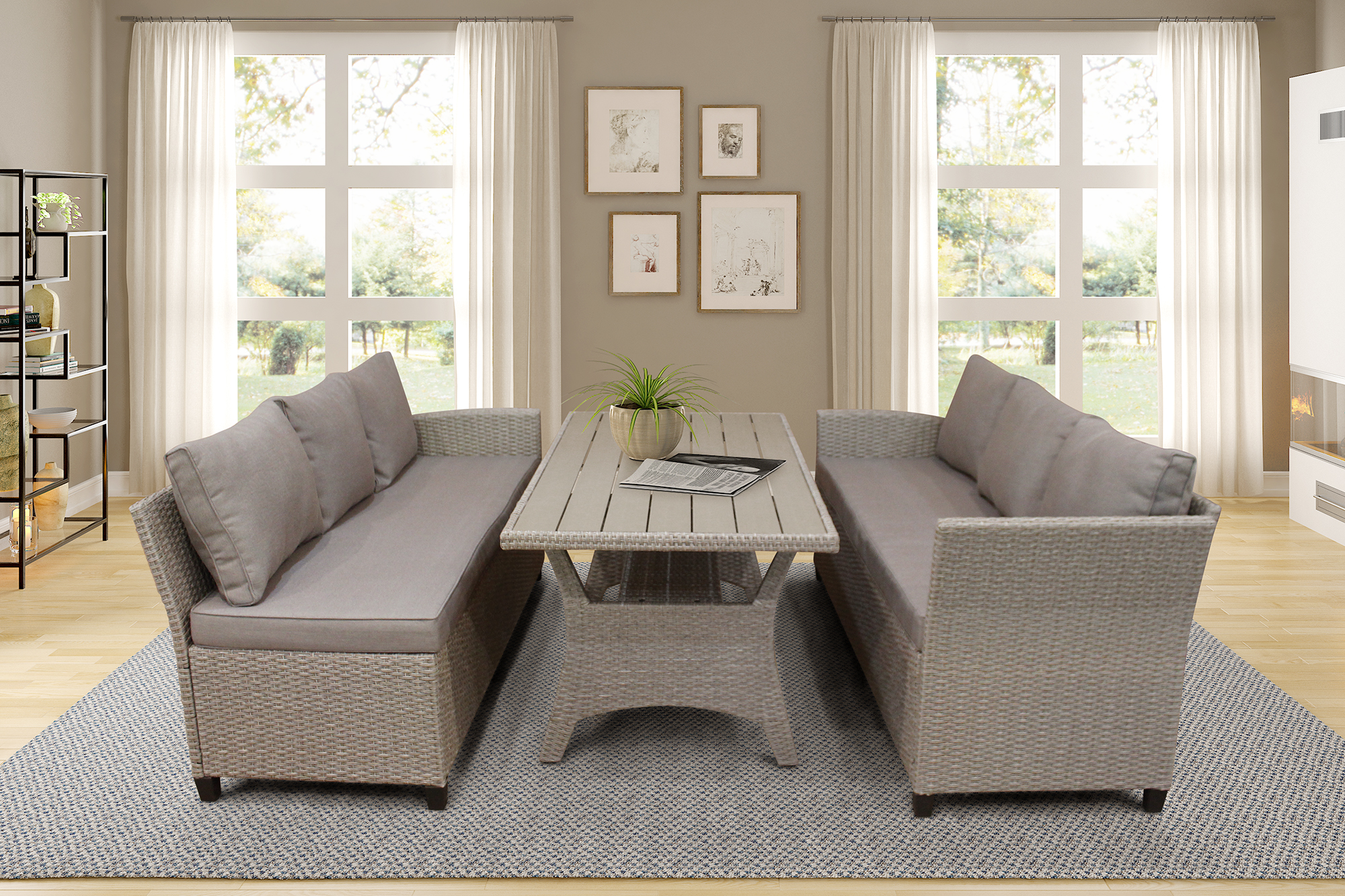 - [Fresh, Attractive Look] Featuring a unique gray gradient, this piece of patio furniture is an eye-catching addition for outdoor patio use. The beautiful wicker sofa and slatted faux wood table top are designed with a simple but modern design and can help to create cool and relaxing vibes for your next social event or time alone or with family.