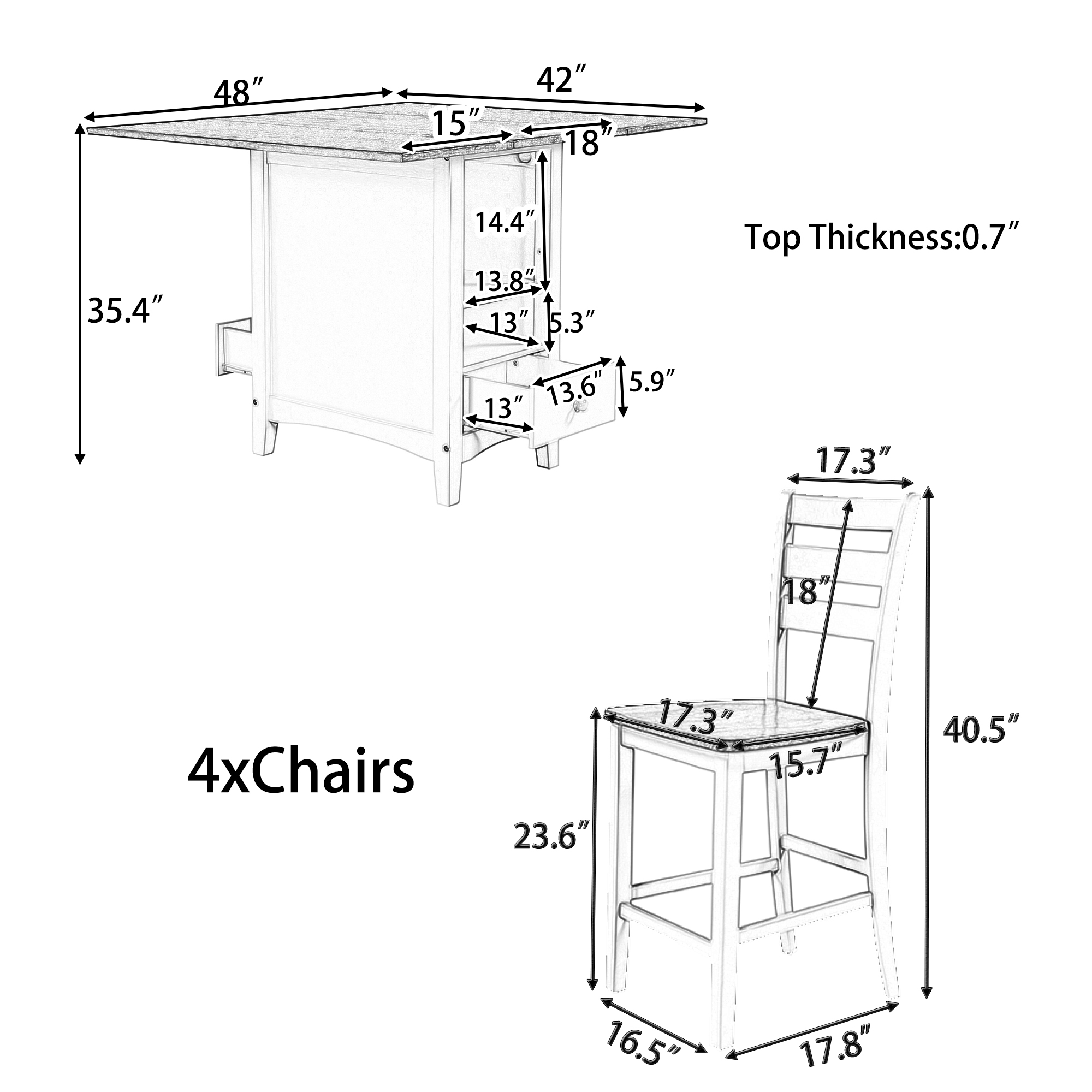 Overall Product Dimension | Dining Table: (18-48)x42x35.4inch(LXWXH) Tabletop thickness:0.7inch Drawer size:13.6x13x5.9inch(LXWXH) Dining Chair: 16.5x17.8x40.5inch(LXWXH); Seat Depth: 18inch; Seat to Floor: 23.6inch |
