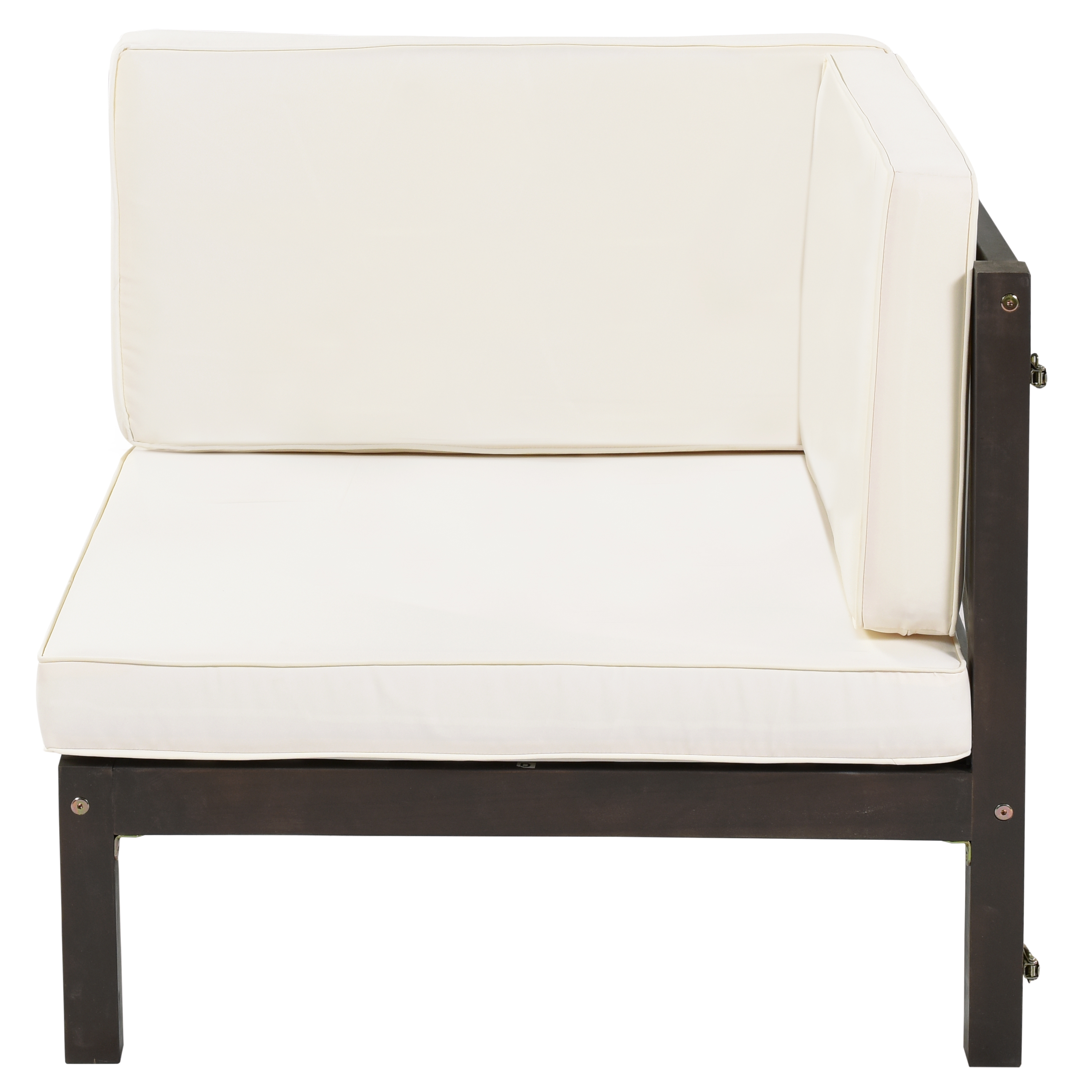 This sectional seating group comes with one right-side armchair, one left-side armchair, one corner piece, one tea table, 3 cushions and 6 back pillows. Featuring wooden X-back frames and classical beige cushions, this set brings a graceful look to any outdoor space especially small places like balconies with the corner design.