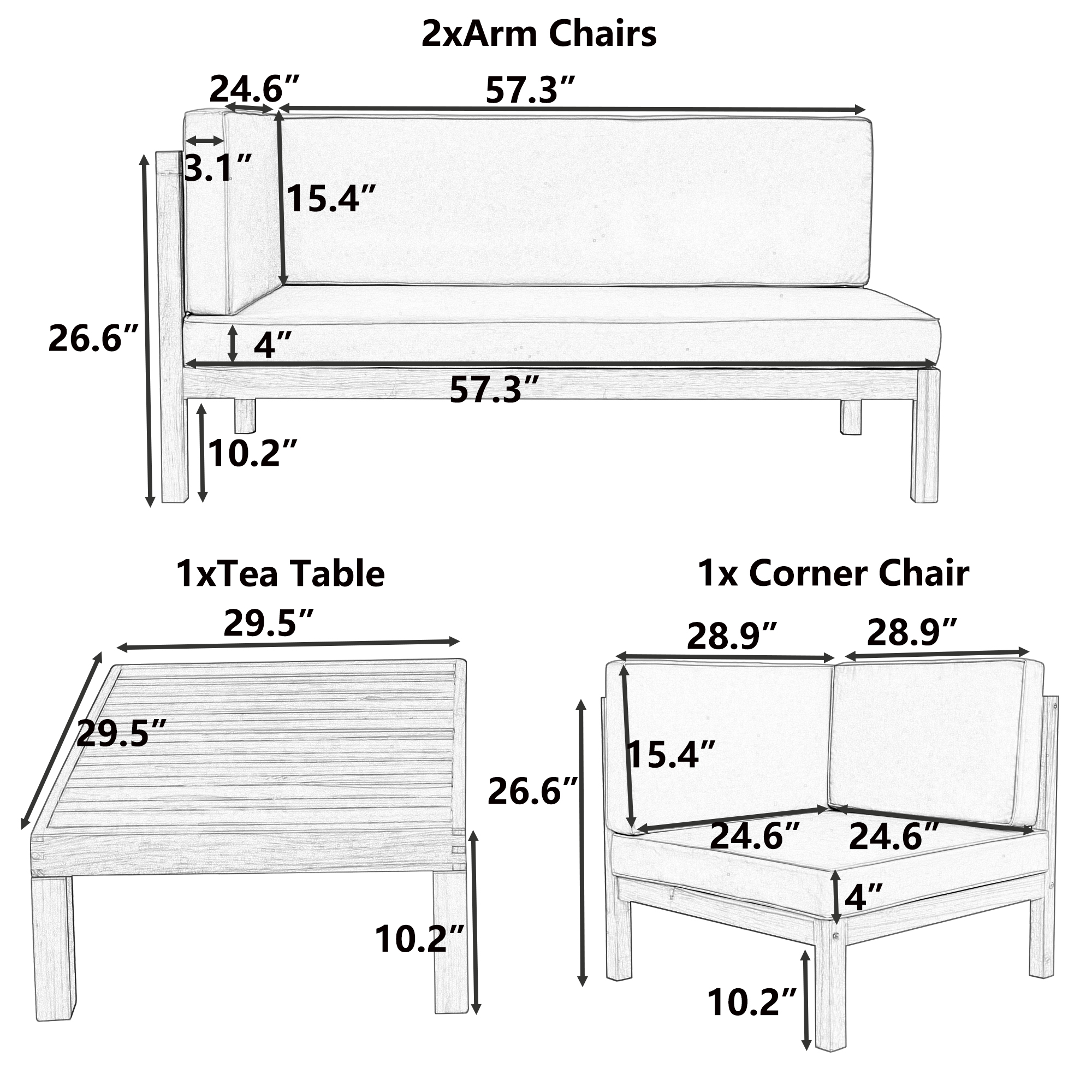 Overall Product Dimension | Arm Chair: 57.3x24.6x26.6inch(LXWXH); Corner Chair: 28.9x28.9x26.6inch(LXWXH); Tea Table: 29.5x29.5x10.2inch(LXWXH); Long Seat Cushion: 57.3x24.6x4inch(LXWXT); Long Back Pillow: 57.3x24.6x3.1inch(LXWXT); Arm Chair Pillow: 24.6x15.4x3.1inch(LXWXT); Corner Chair Seat Cushion: 24.6x24.6x4inch(LXWXT); Corner Chair Back Pillow: 28.9x15.4x3.1inch(LXWXT)