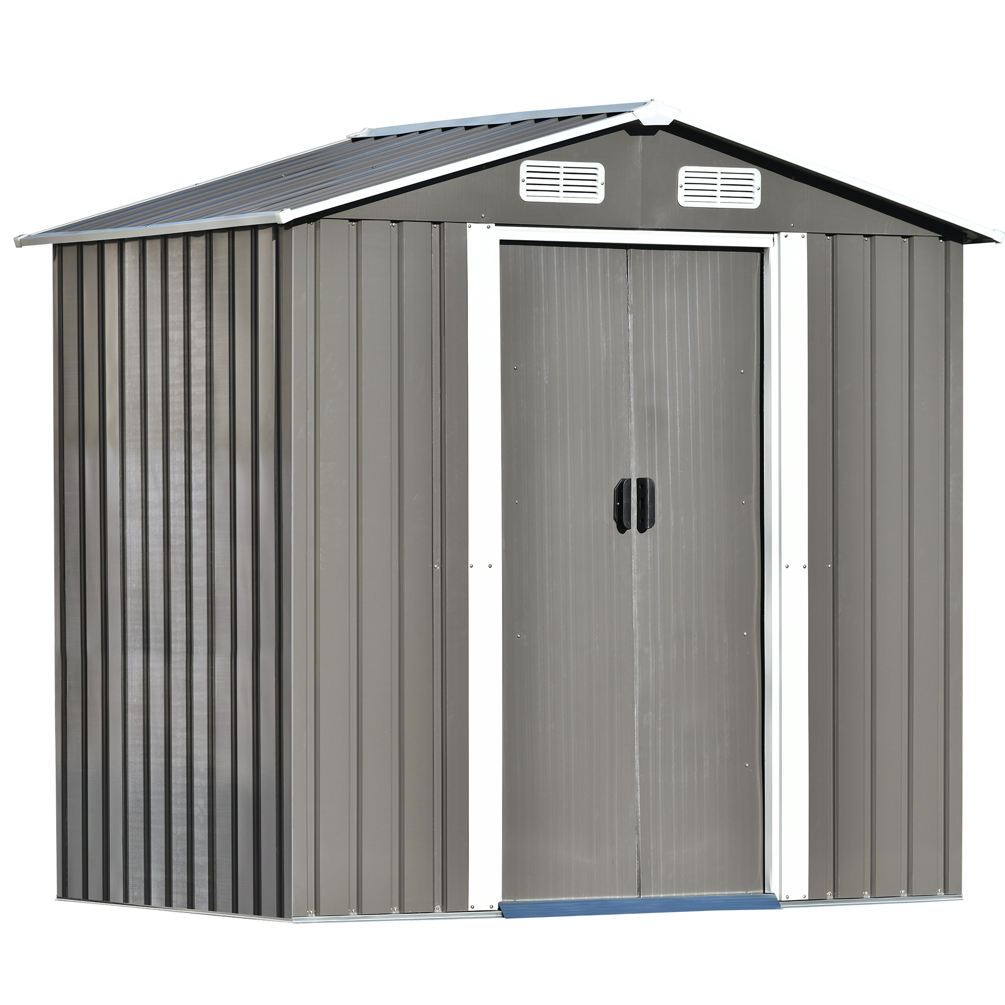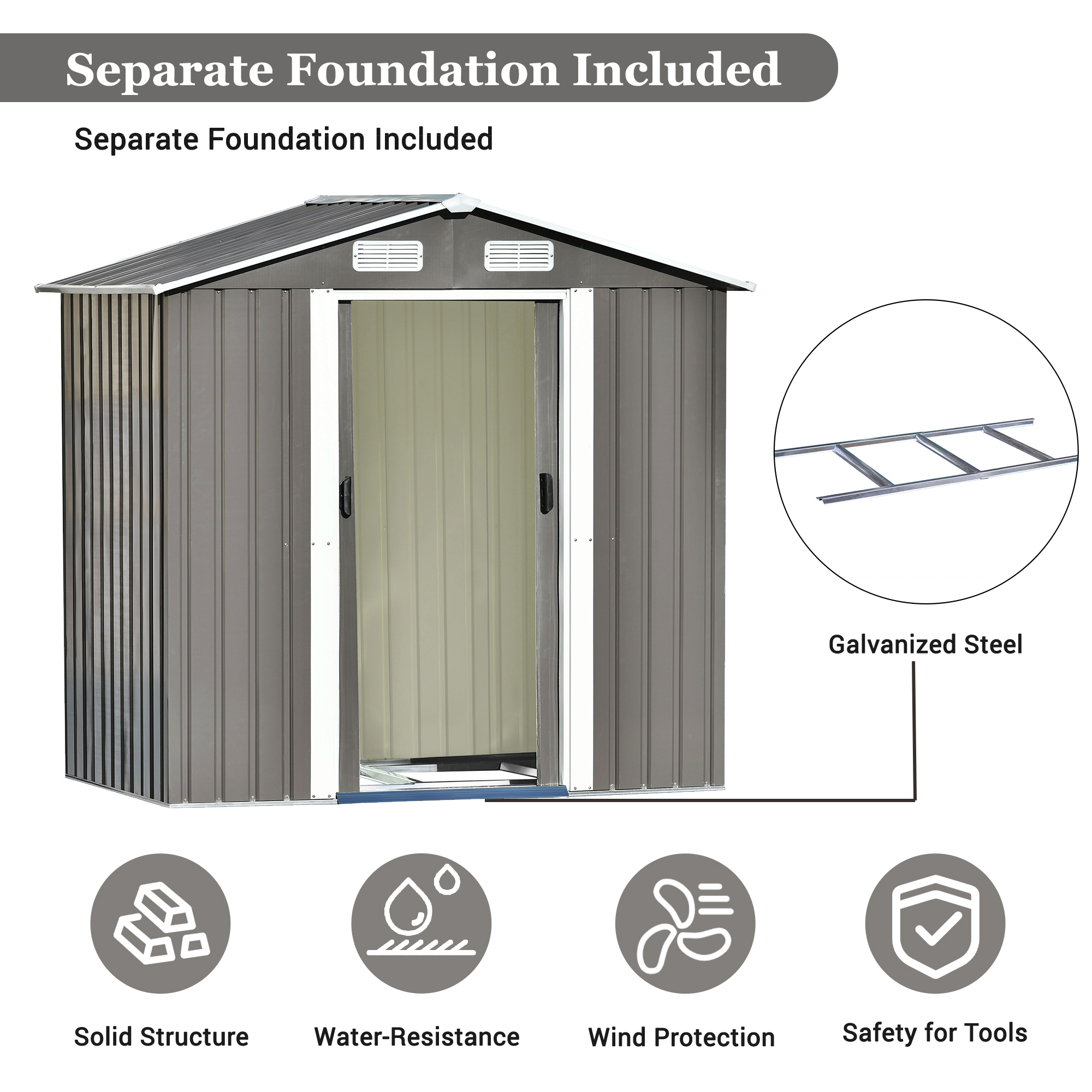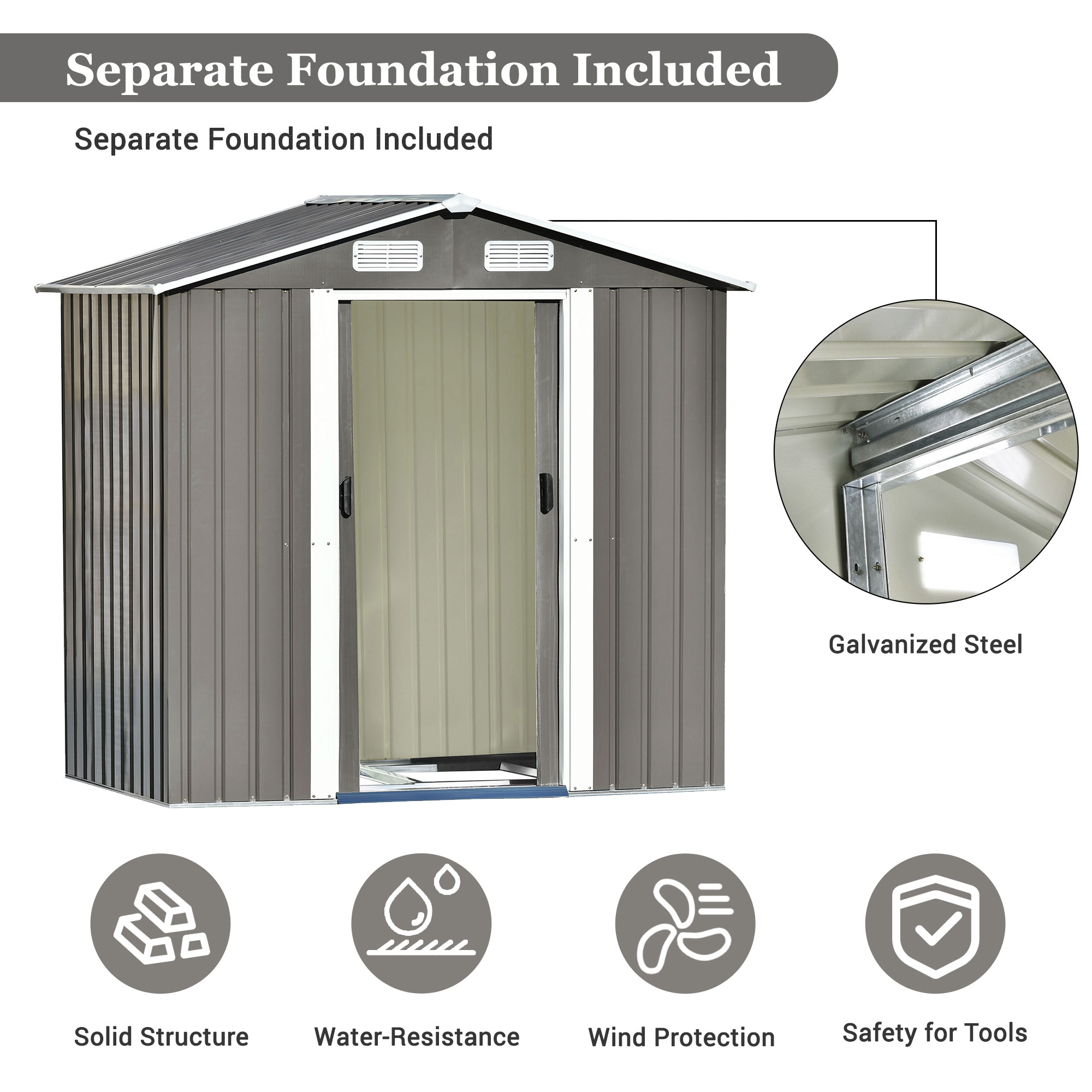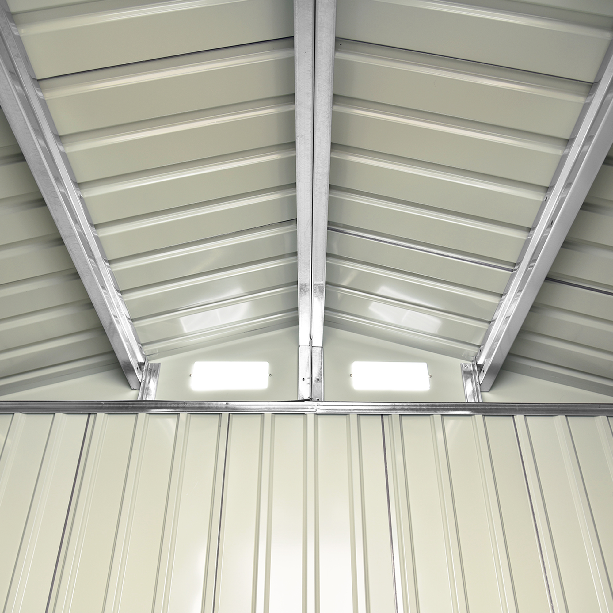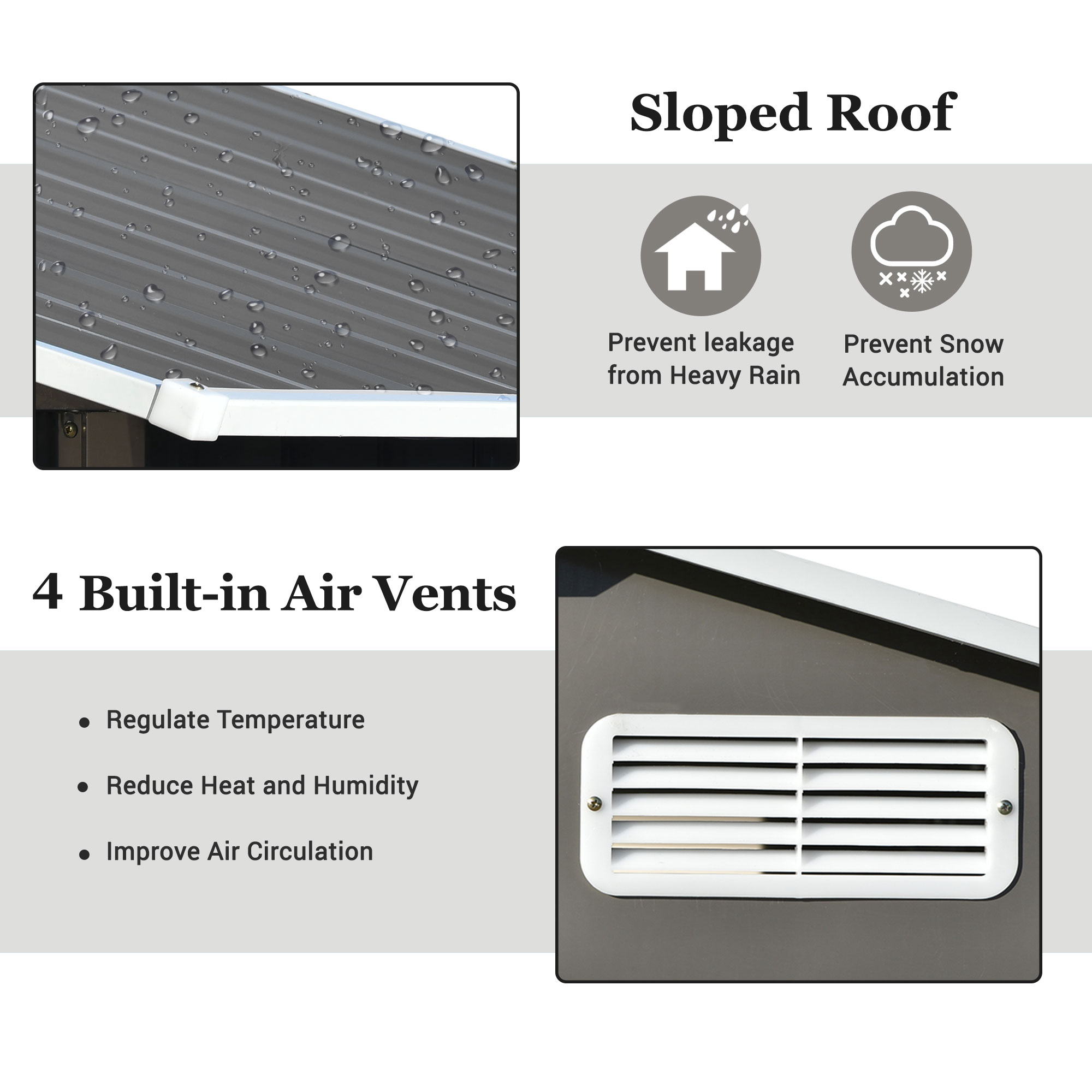 Compared with wooded storage shed, a metal shed is more durable with its galvanized steel material. Sloped roof is responsible for drainage and will help avoiding leakage or accumulation from the heavy rain or heavy snow effectively. 4 built-in vents are designed for regulating temperature, reducing heat and humidity as well as improving air circulation which will help keep your tools in good condition.