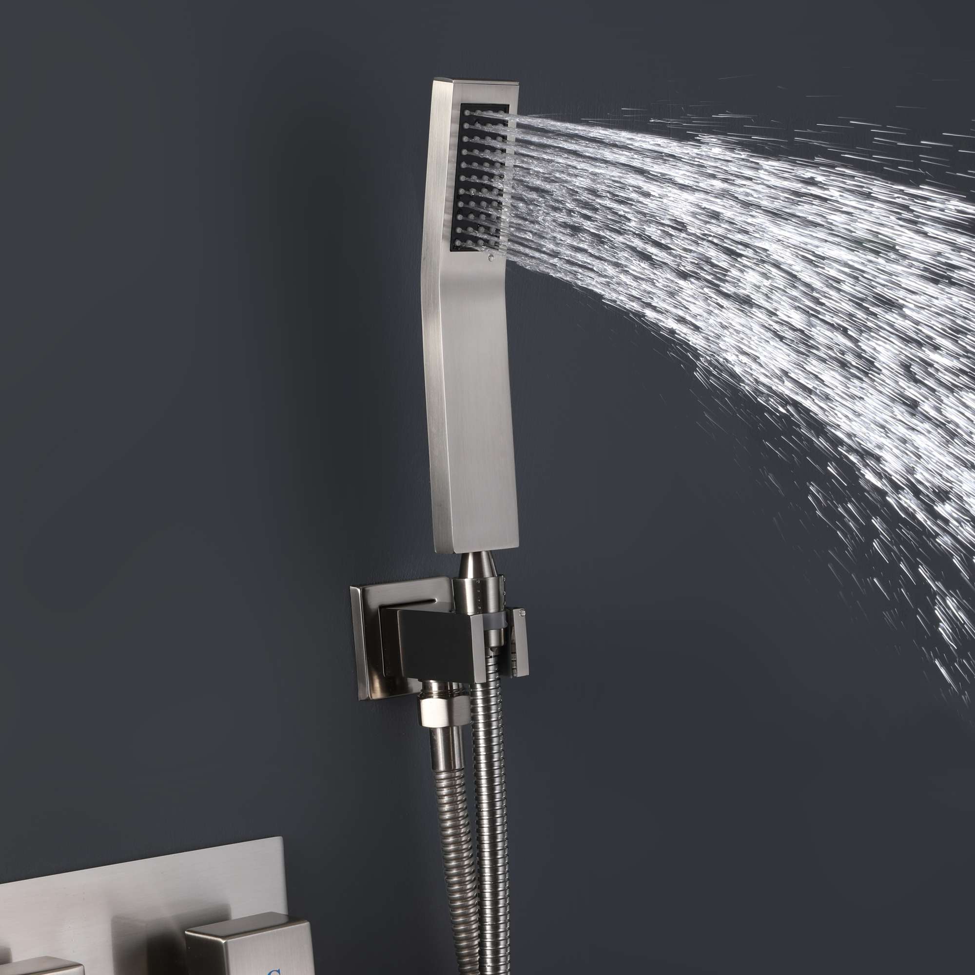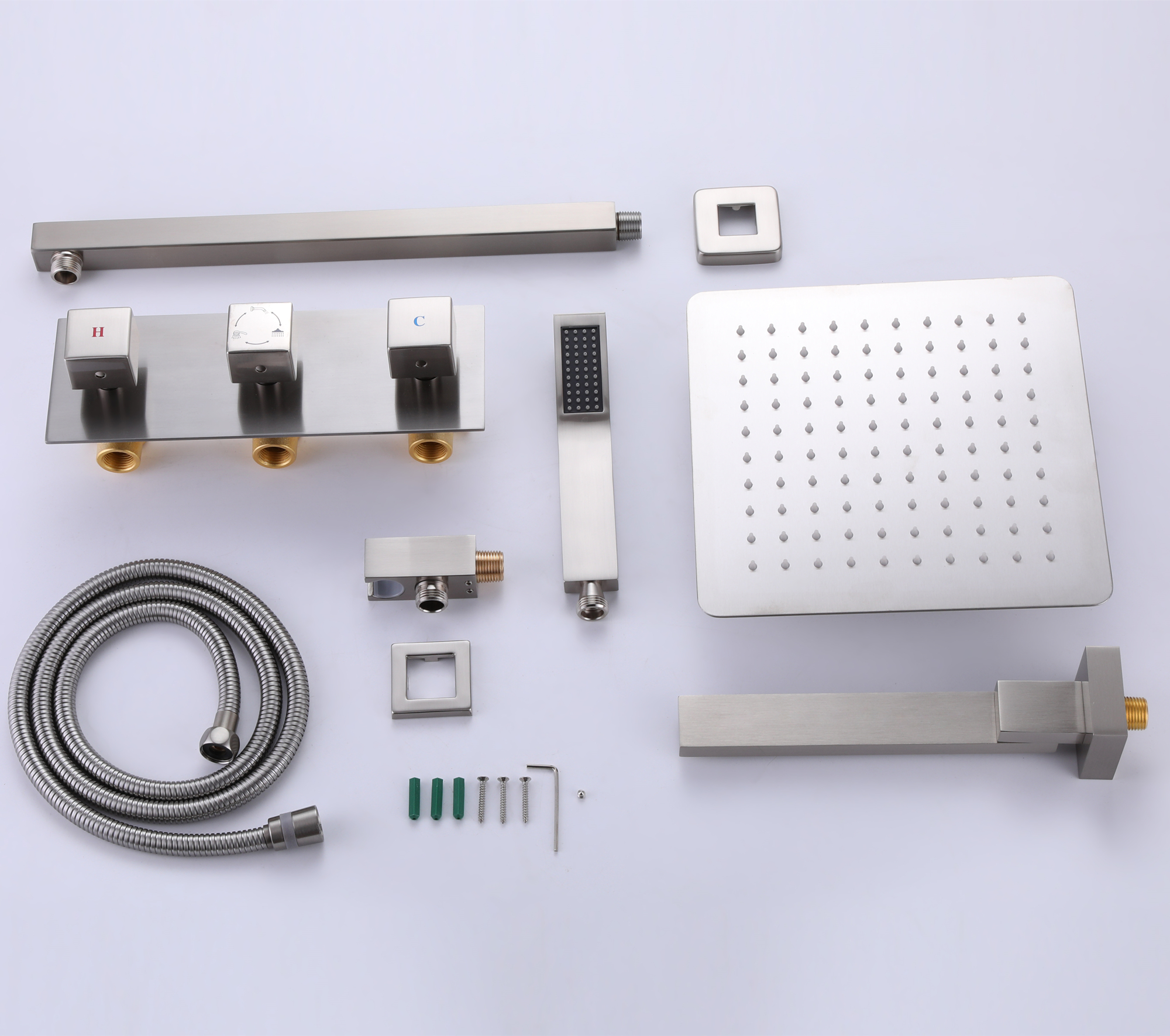 4. This brushed nickel polished shower faucet, square hand shower, unique design, high standard brushed nickel finished on the surface, scratch-resistant, corrosion-resistant, and easy to clean.