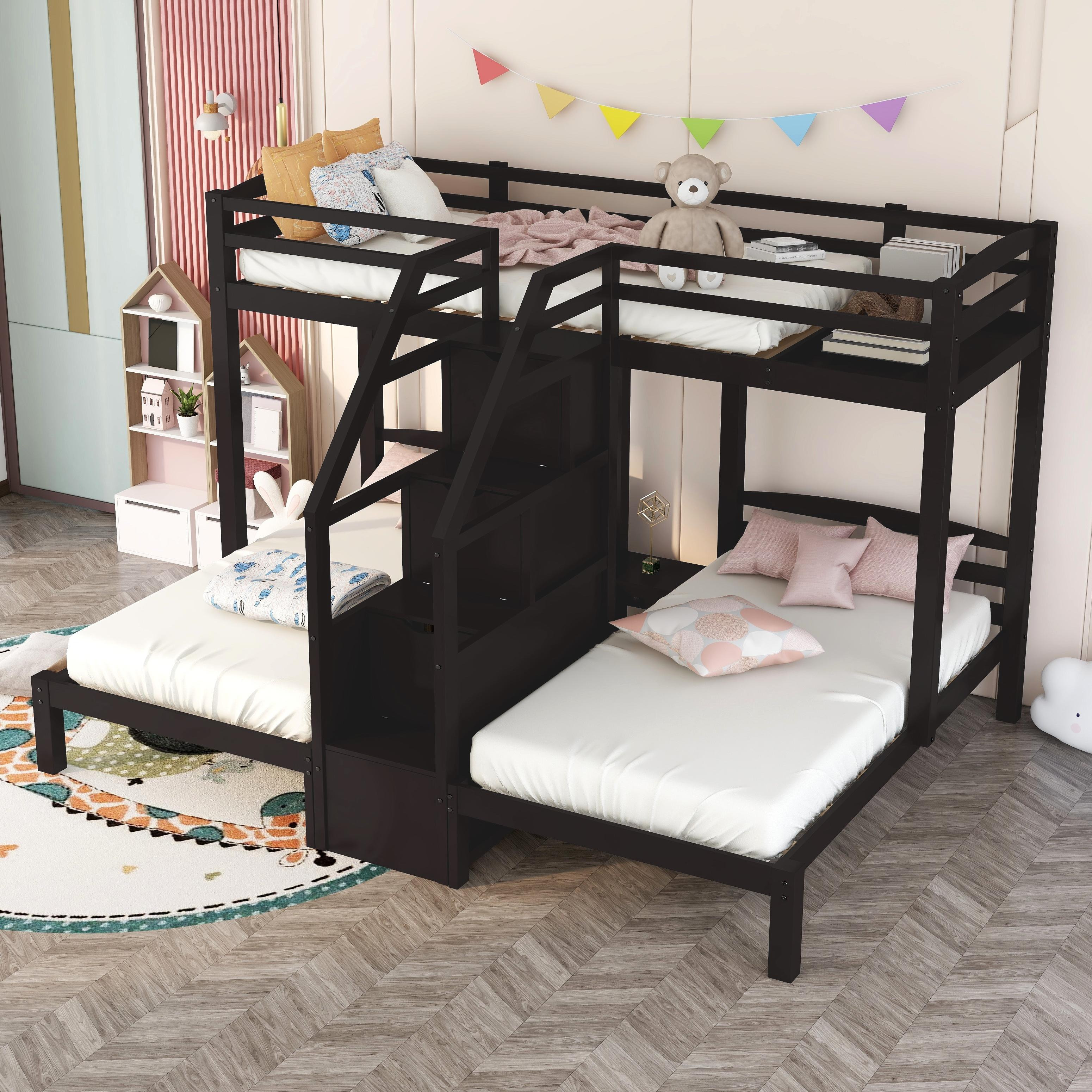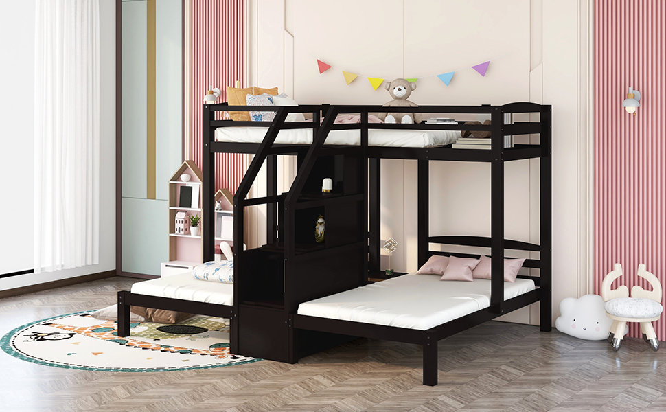 This bunk bed is a real space saver by combining three beds into one. With an upper twin-size bed and two twin beds down, this bed is perfect for guests and overnight stays, as well as for families with multiple members. The built-in staircase between the two beds can be used for storage,and there is also a little drawer between the down two beds for strong daily necessities such as phones or bottles.This bed is of high quality and versatility, making it the perfect addition to your bedroom.