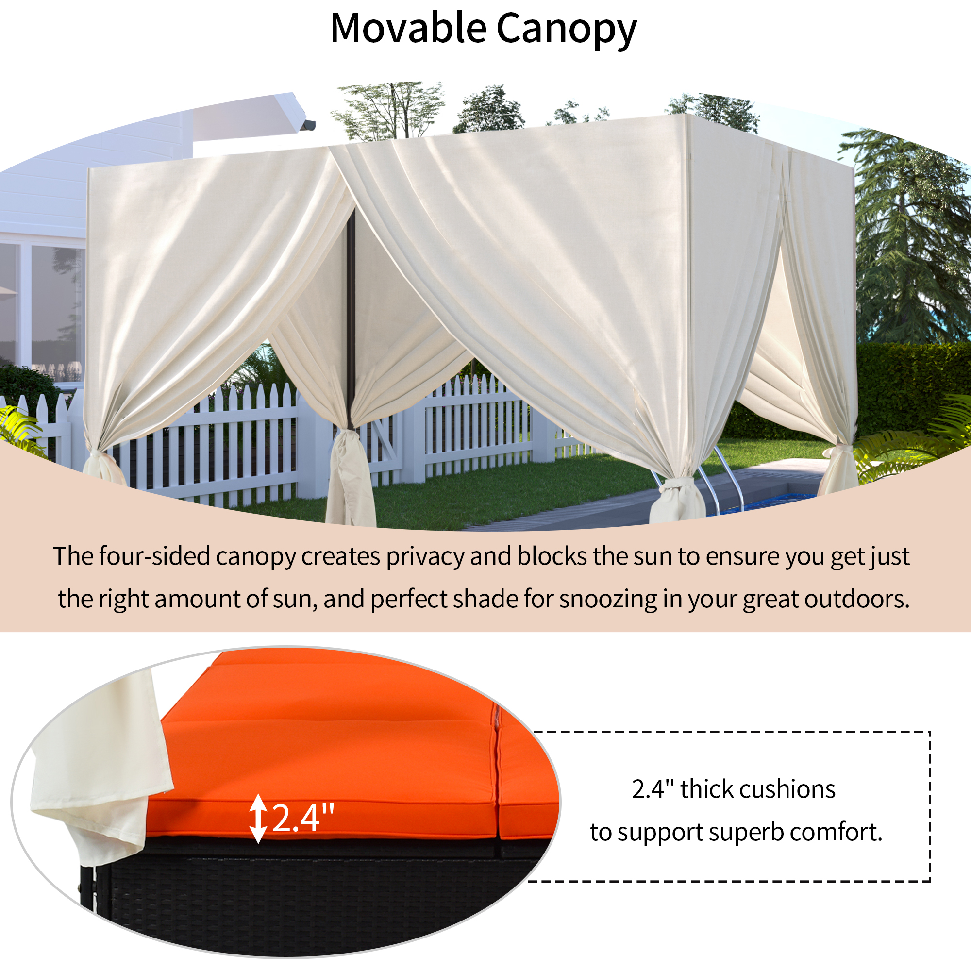 Designed with chic, romantic and pure style, this rattan sunbed gives you a shady and comfortable place to lounge outdoors, it is an ideal hideaway for relaxing and enjoy your leisure time near the swimming pool in the garden. This outdoor sunbed with four-sided canopy and overhead curtains provides both shade and privacy and the canopy can be tied side to keep the panels open as needed. With this elegant sun bed, you can show your appreciation for ambiance as well as your trendy lifestyle.