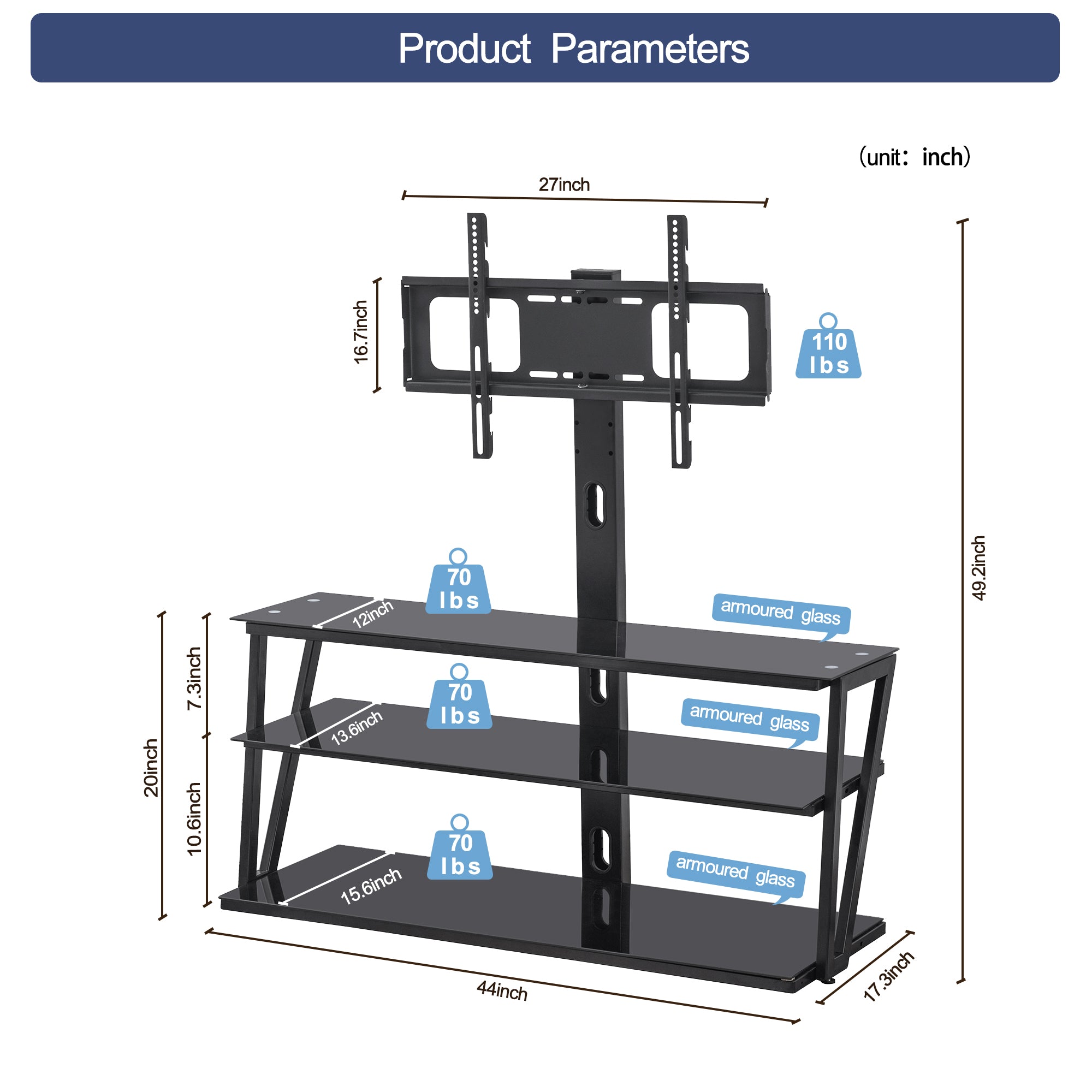 BLACK TEMPERED GLASS - Black tempered glass,Capacity for shelf: 70lbs, 110lbs for mount, Beveled glass design,Improve security,silk screen tempered glass Can effectively avoid scratches.
