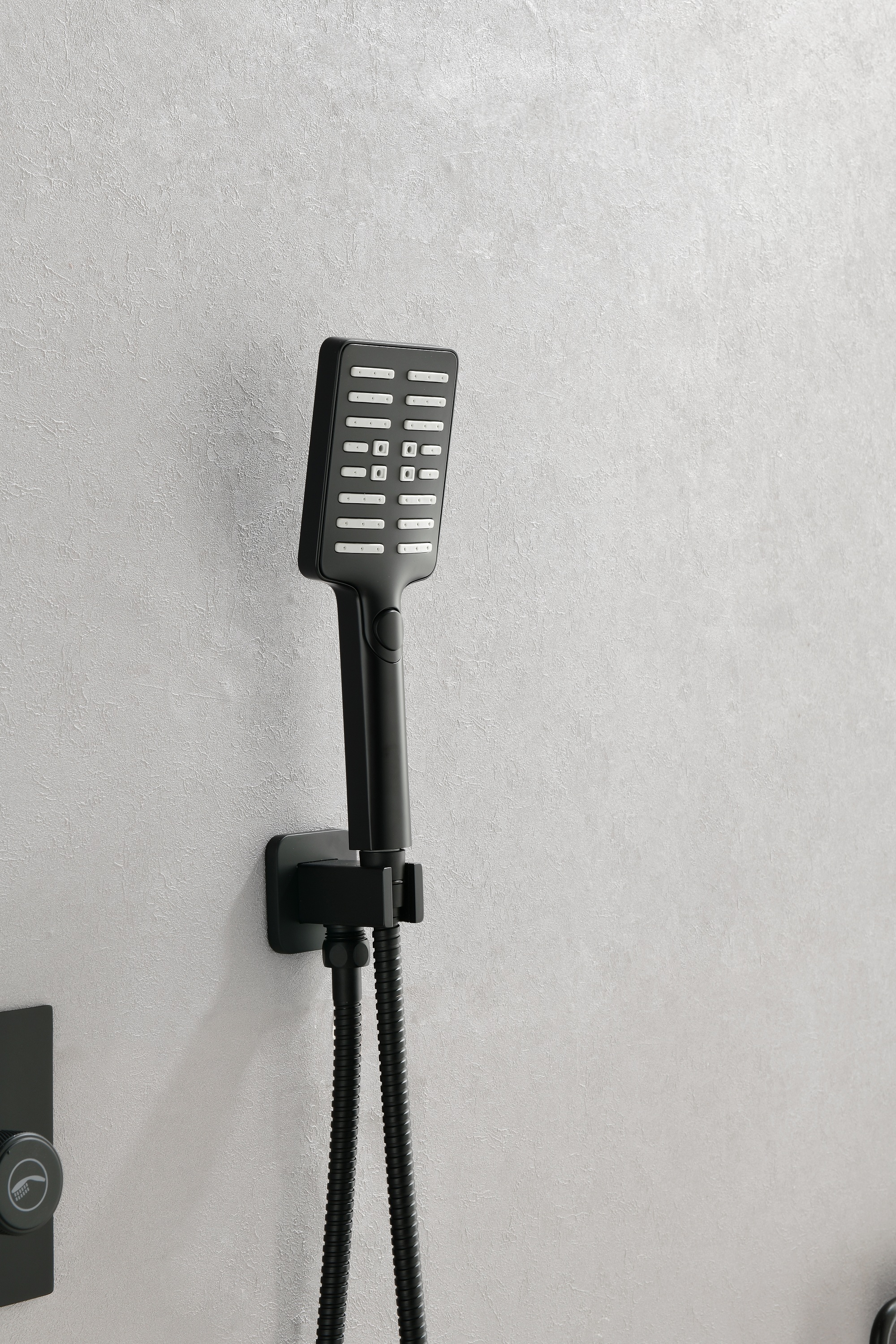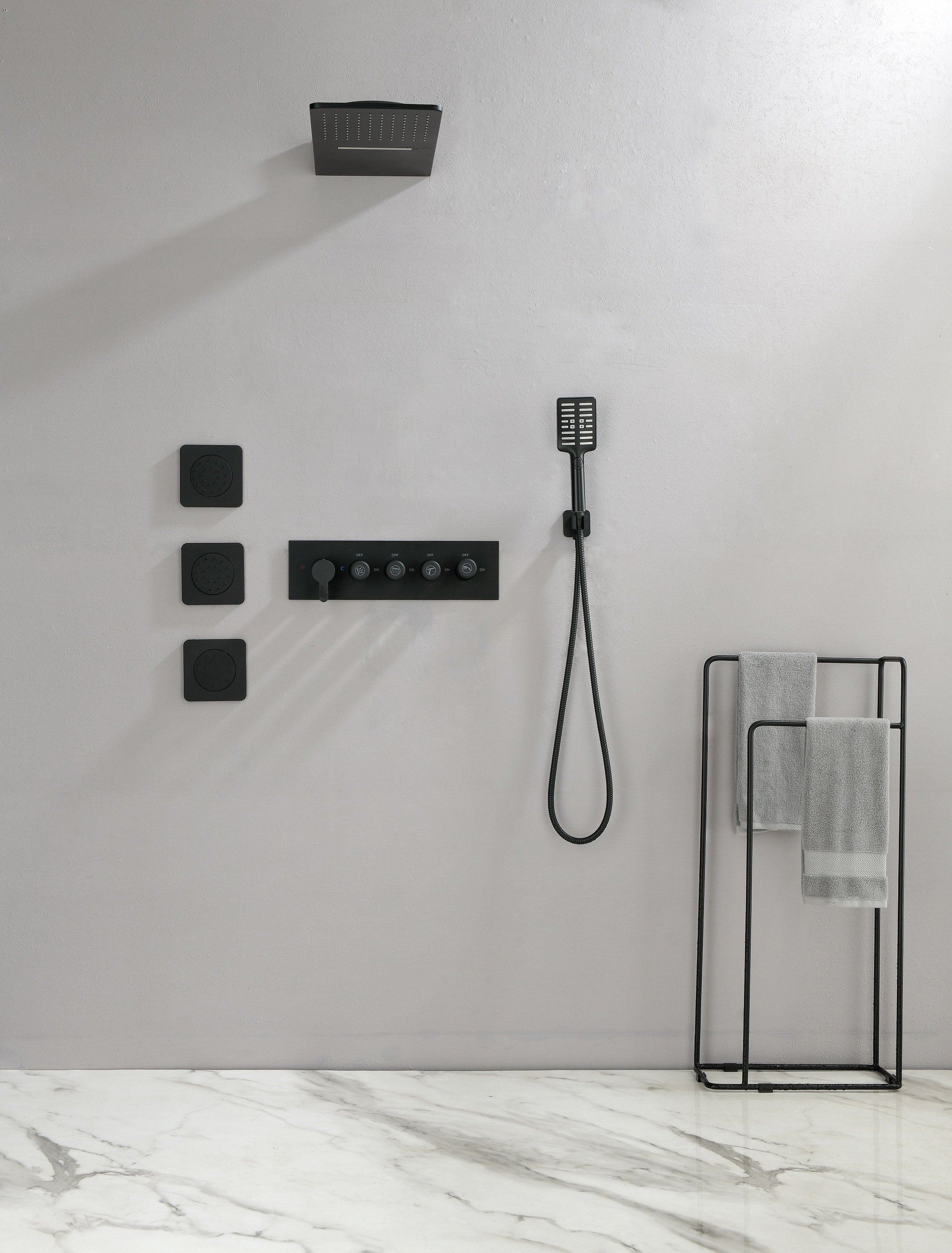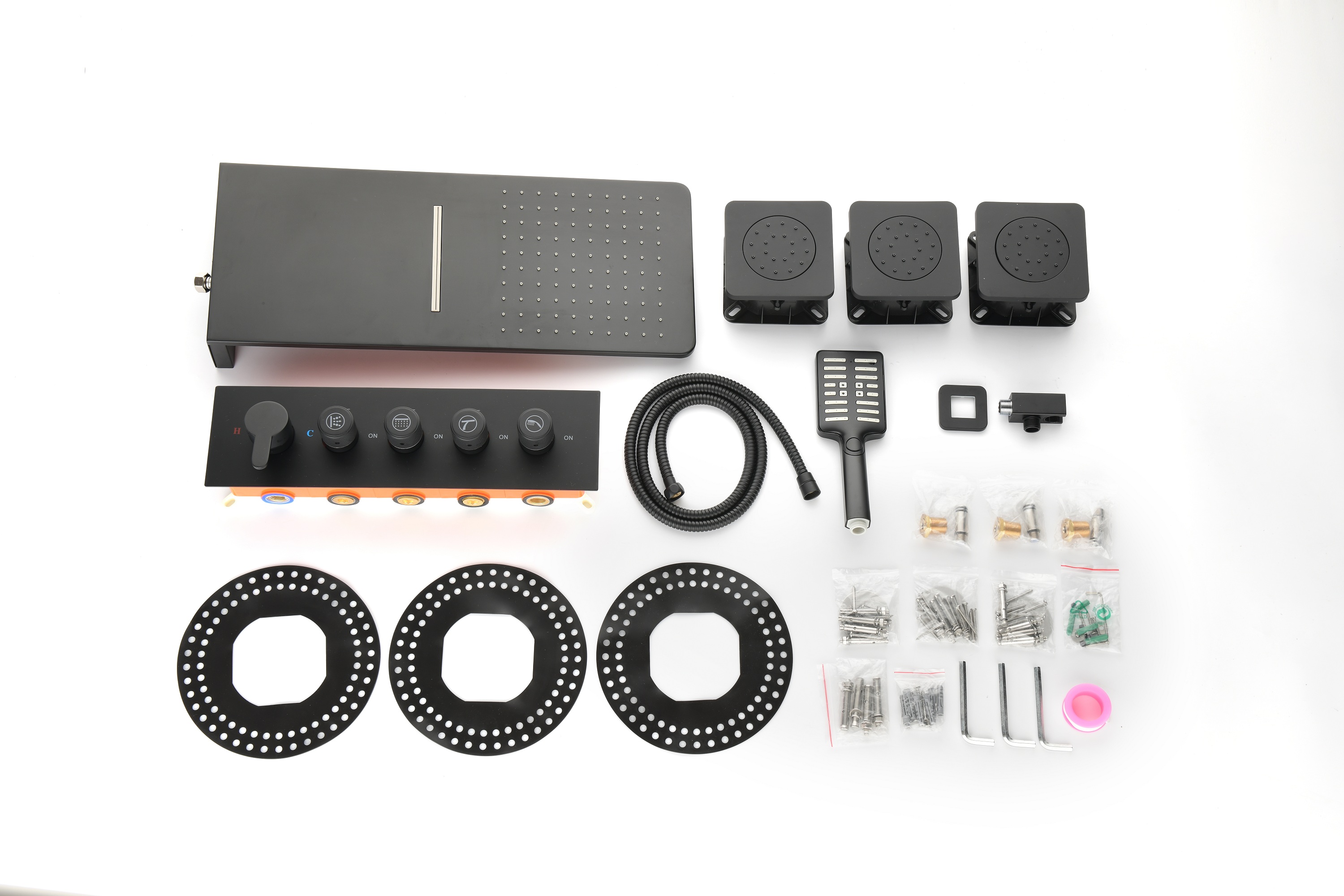 6.hand shower, mounting hardware, rain shower head, shower hose, valve & trims, body jets