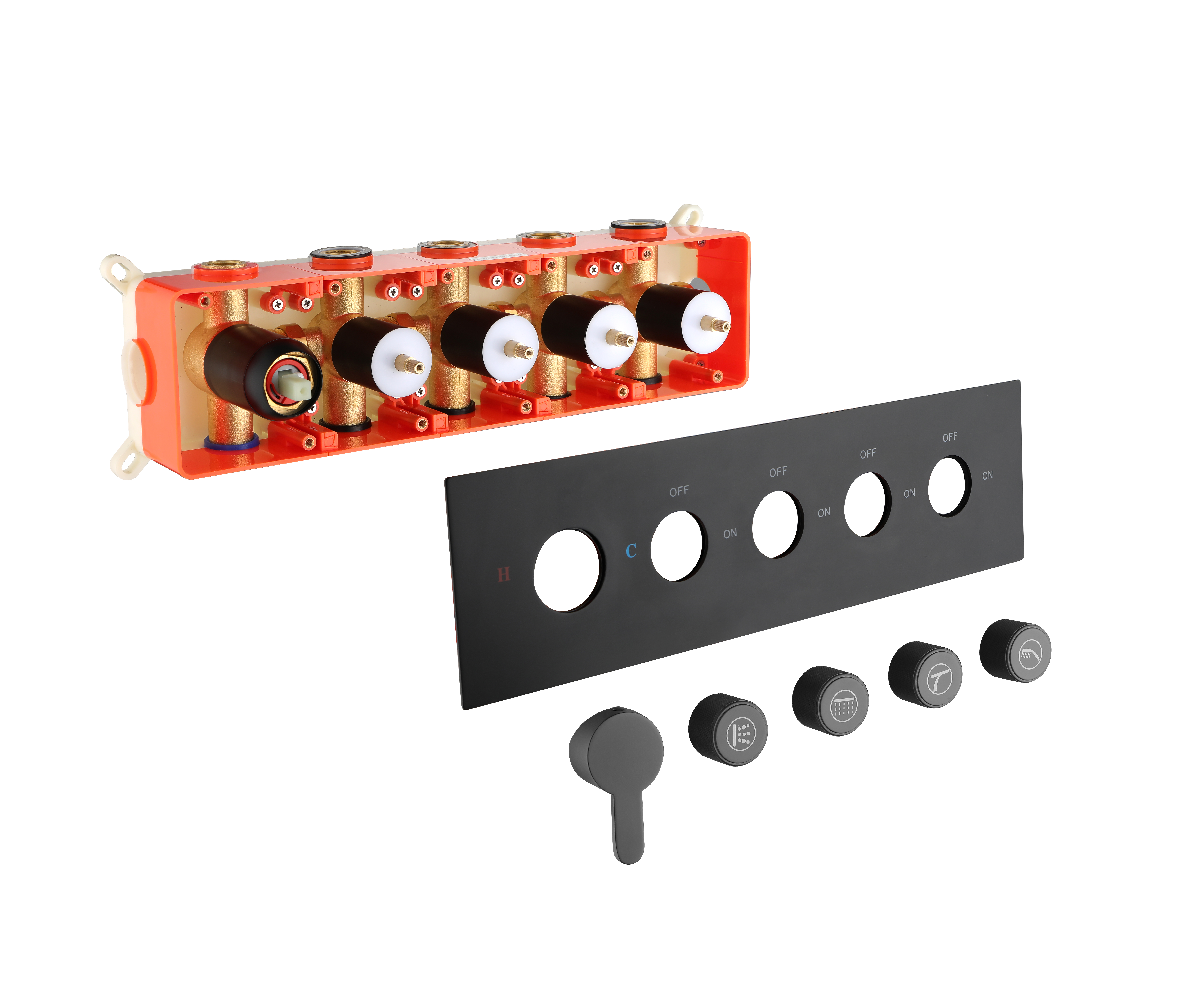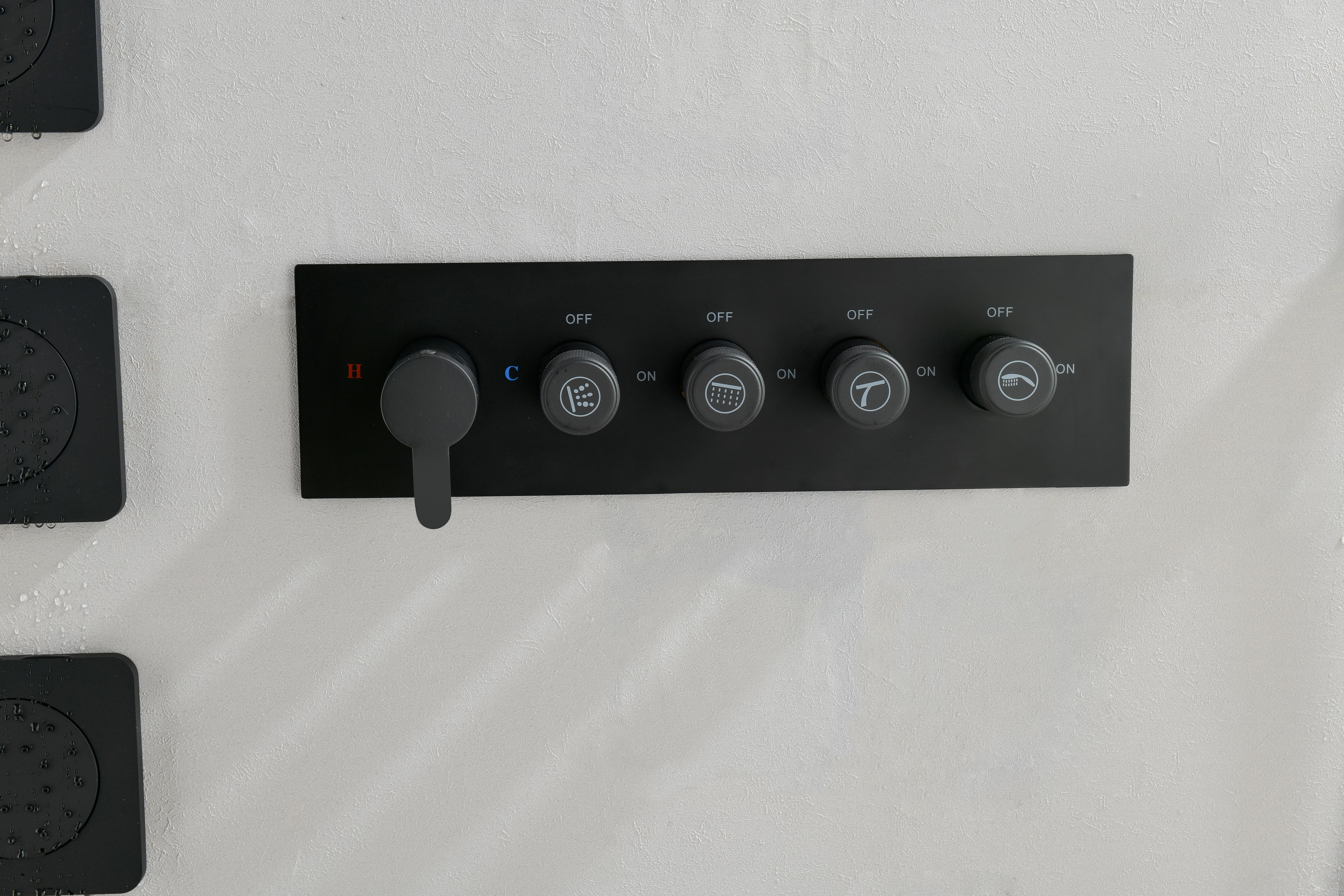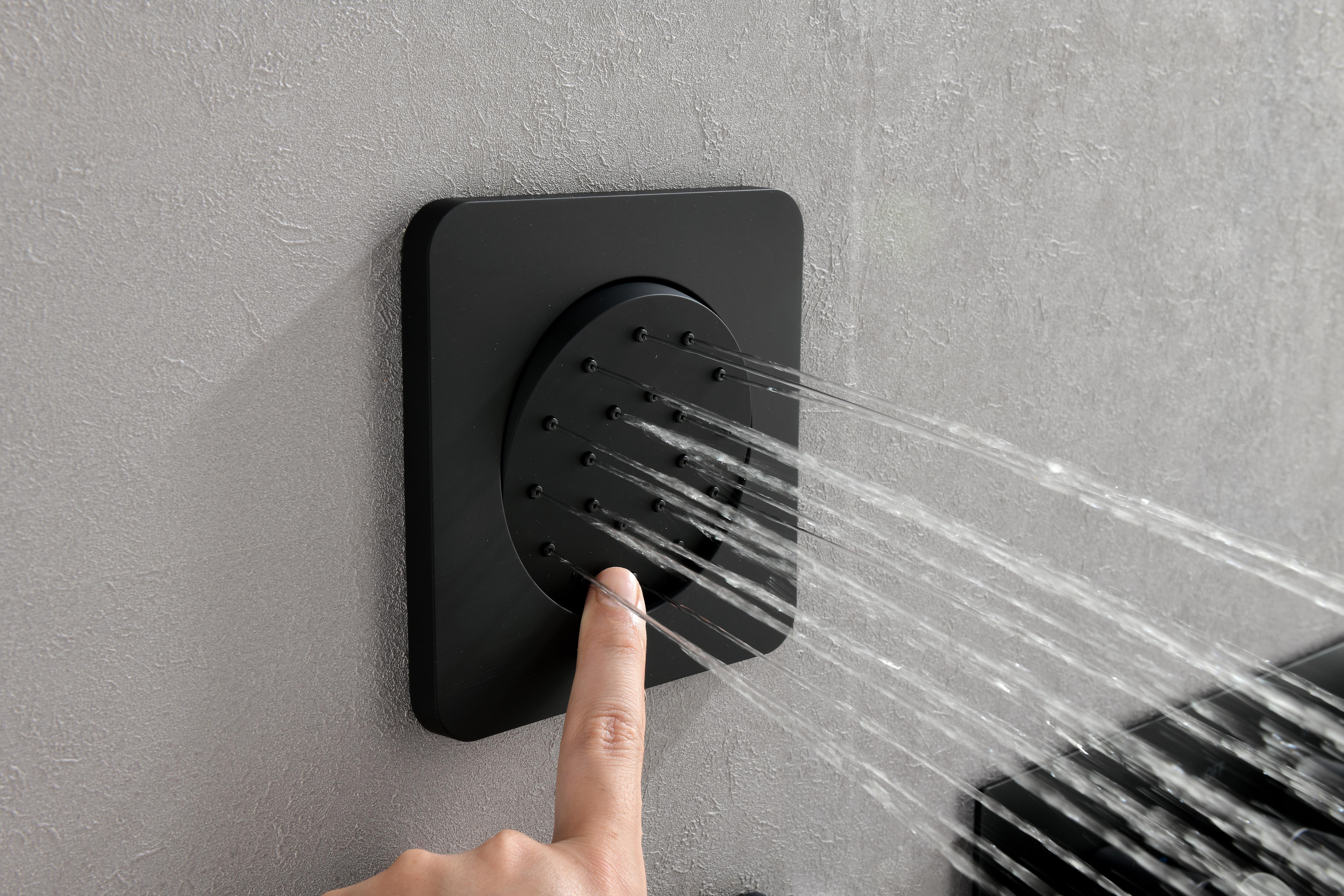 6.hand shower, mounting hardware, rain shower head, shower hose, valve & trims, body jets
