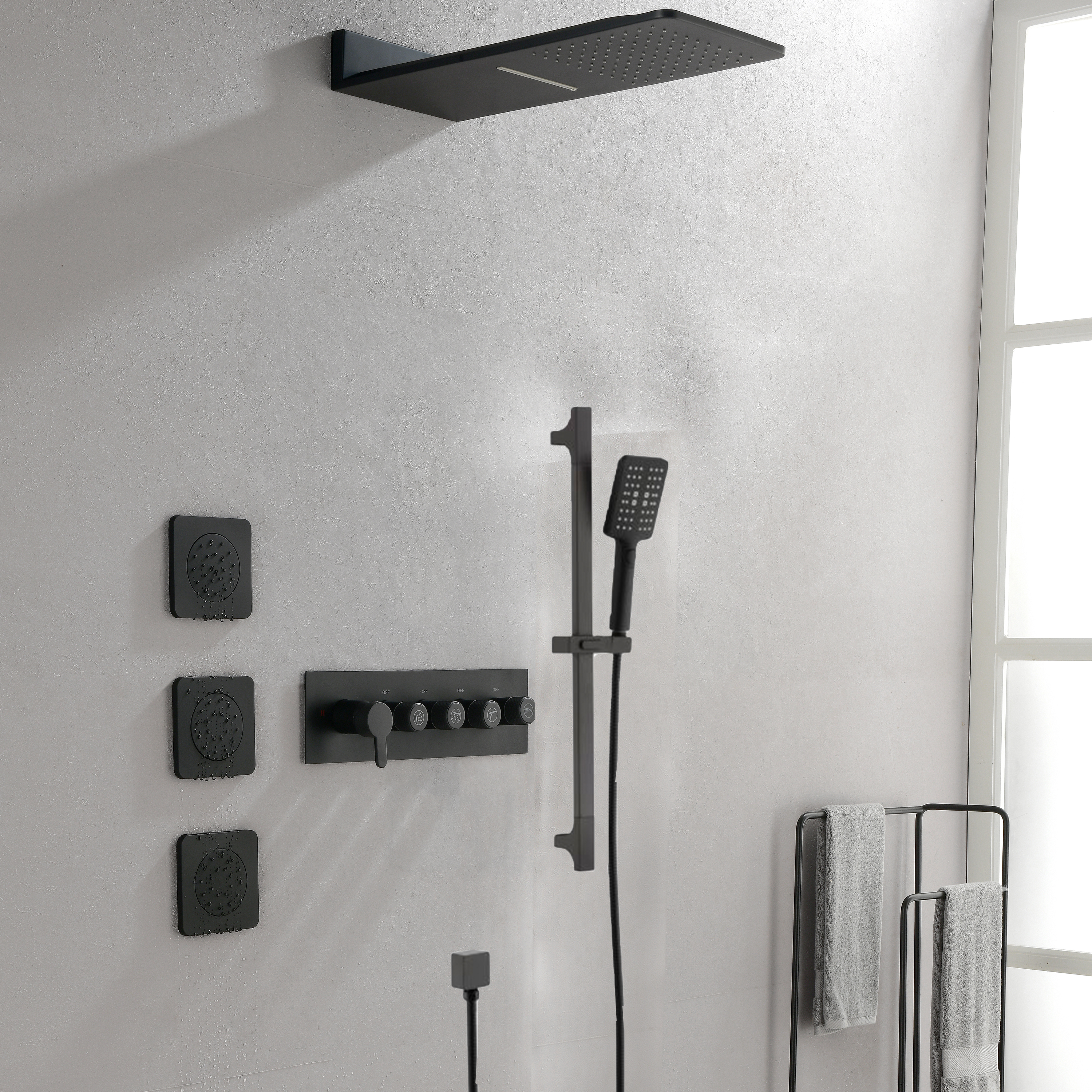 Multiple Functions: Dual functional waterfall rain shower head in offers a wide radius of full rain and waterfall spray on your skin,hand shower for targeted cleaning and washing,three spray jets for body massage.