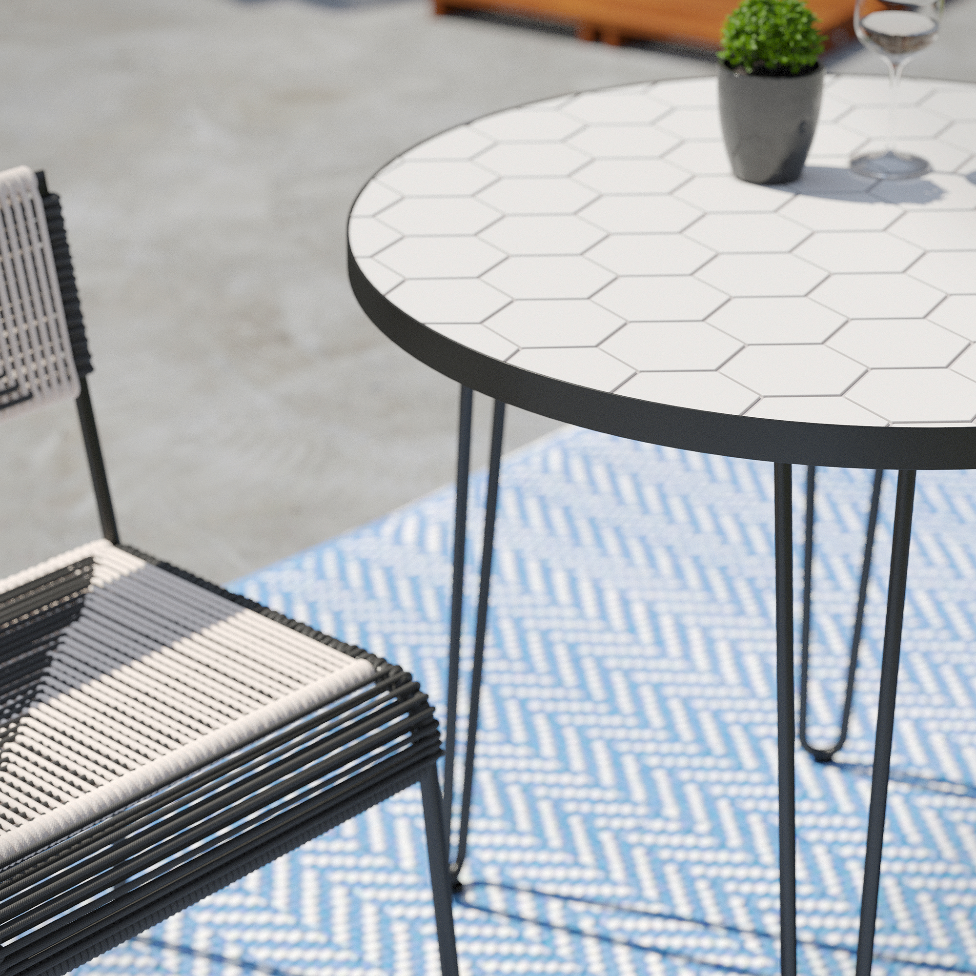 Enjoy al fresco dining with this modern bistro set. Serve drinks and appetizers from the white hexagon tile tabletop while sitting comfortably on black and white woven chairs. Slide this set onto your screened-in porch for game time with friends, or station in your breakfast nook for a relaxing weekend meal. Center your outdoor entertaining around this stylish table and chairs for family fun in any season.